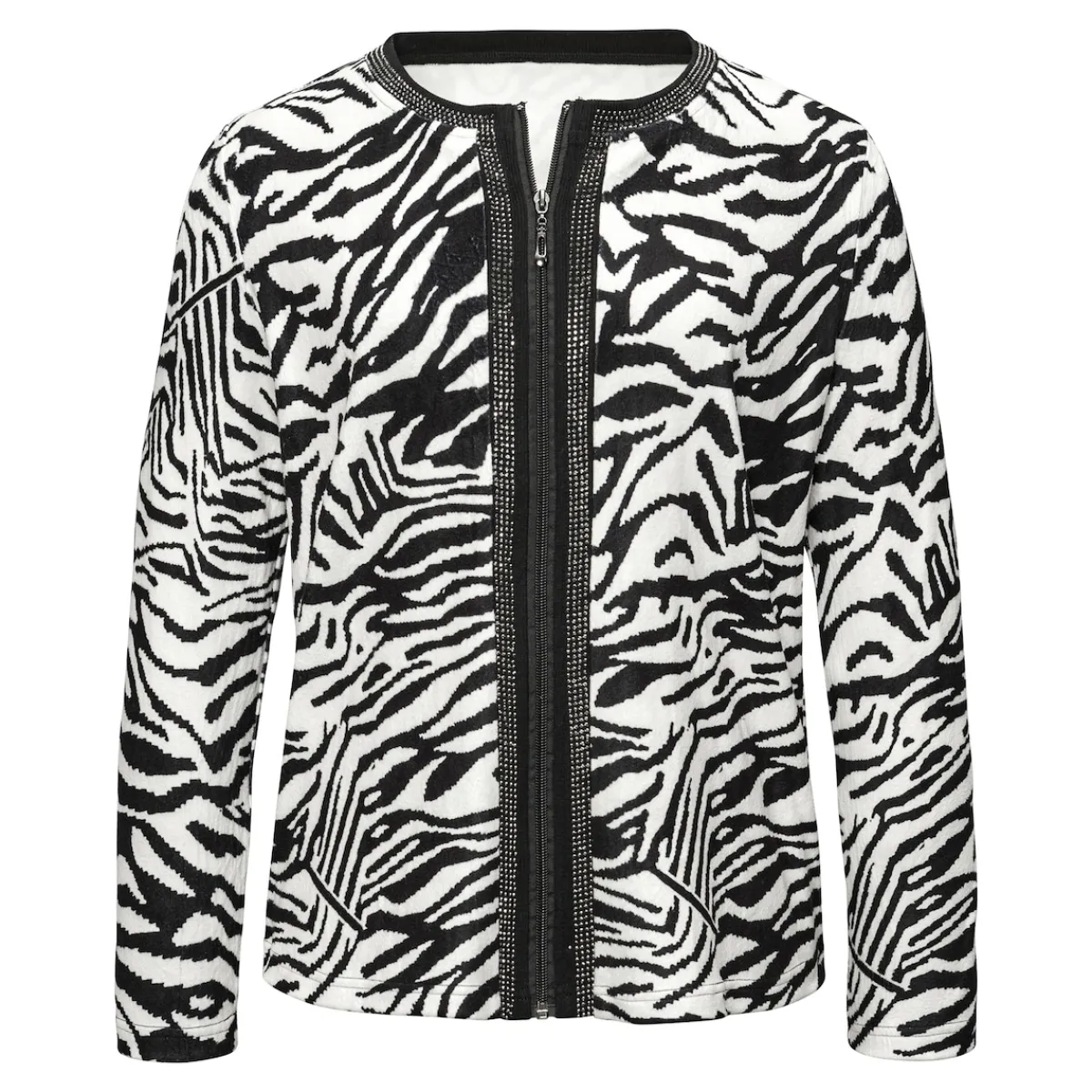 Schick im Animal-Print: Dieser Cardigan mit markantem Zebramuster und Glitzersteinchen an der Reißverschlussblende verwöhnt mit kuscheligem Gewebe und bietet höchsten Tragekomfort.