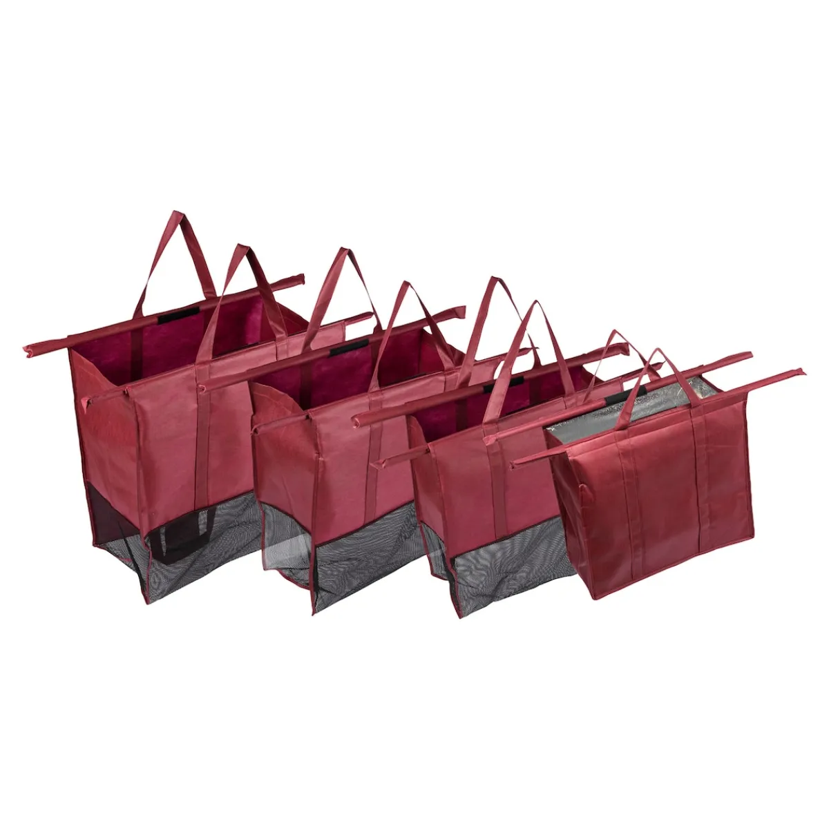 Jetzt können Plastiktüten einpacken, denn dieses Taschenset beweist Ihren guten Geschmack und steht für ein umweltbewusstes Verhalten. Praktisch: In der kleinen Tasche mit Isolierung wird auch Kühlware problemlos nach Hause transportiert. Alle 4 Einkaufswagen-Taschen passen exakt in handelsübliche Einkaufswägen und sind bei Nichtgebrauch platzsparend im Kofferraum verstaubar.