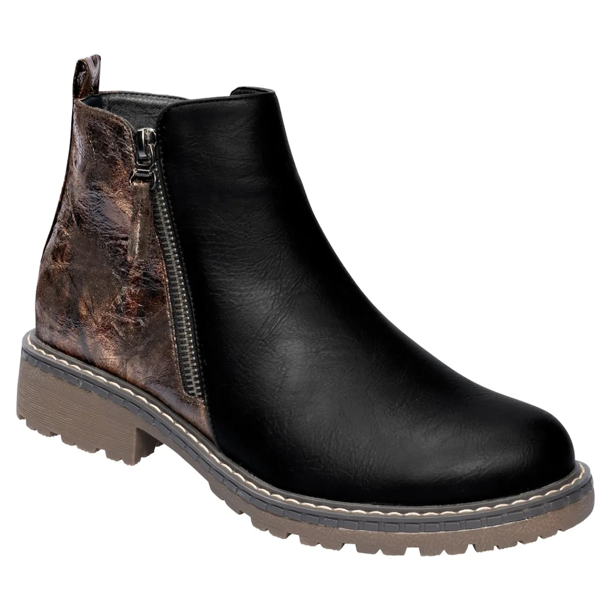 Bequem und voll im Trend: Mit seinem warmen Übergangsfutter und der rutschhemmenden Profil-Laufsohle bietet dieser Fashion-Boot behagliche Wärme und sicheren Halt in der kalten Jahreszeit. Stilvolle Details wie der modische Metallic-Effekt und die Ziernähte verleihen ihm eine trendige Note. Mit Reißverschluss an der Innenseite und Anziehlasche für einen schnellen Ein- und Ausstieg.