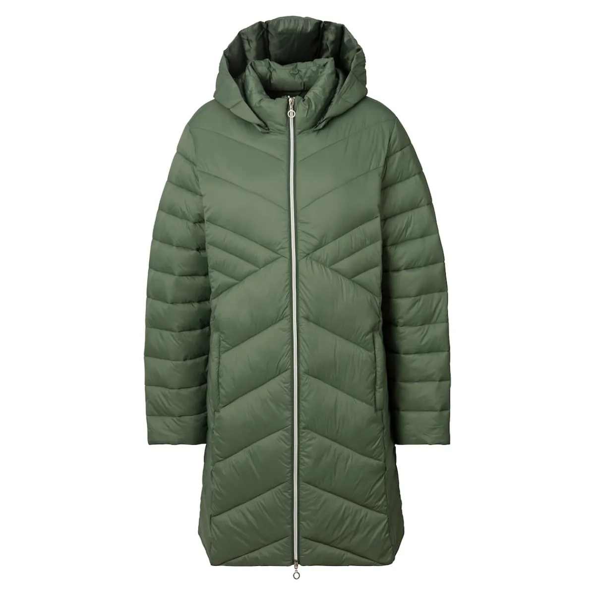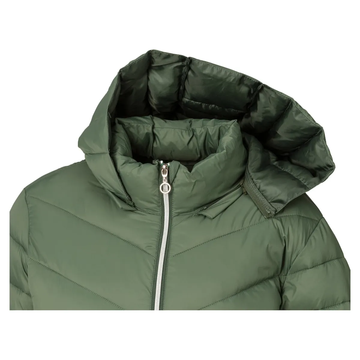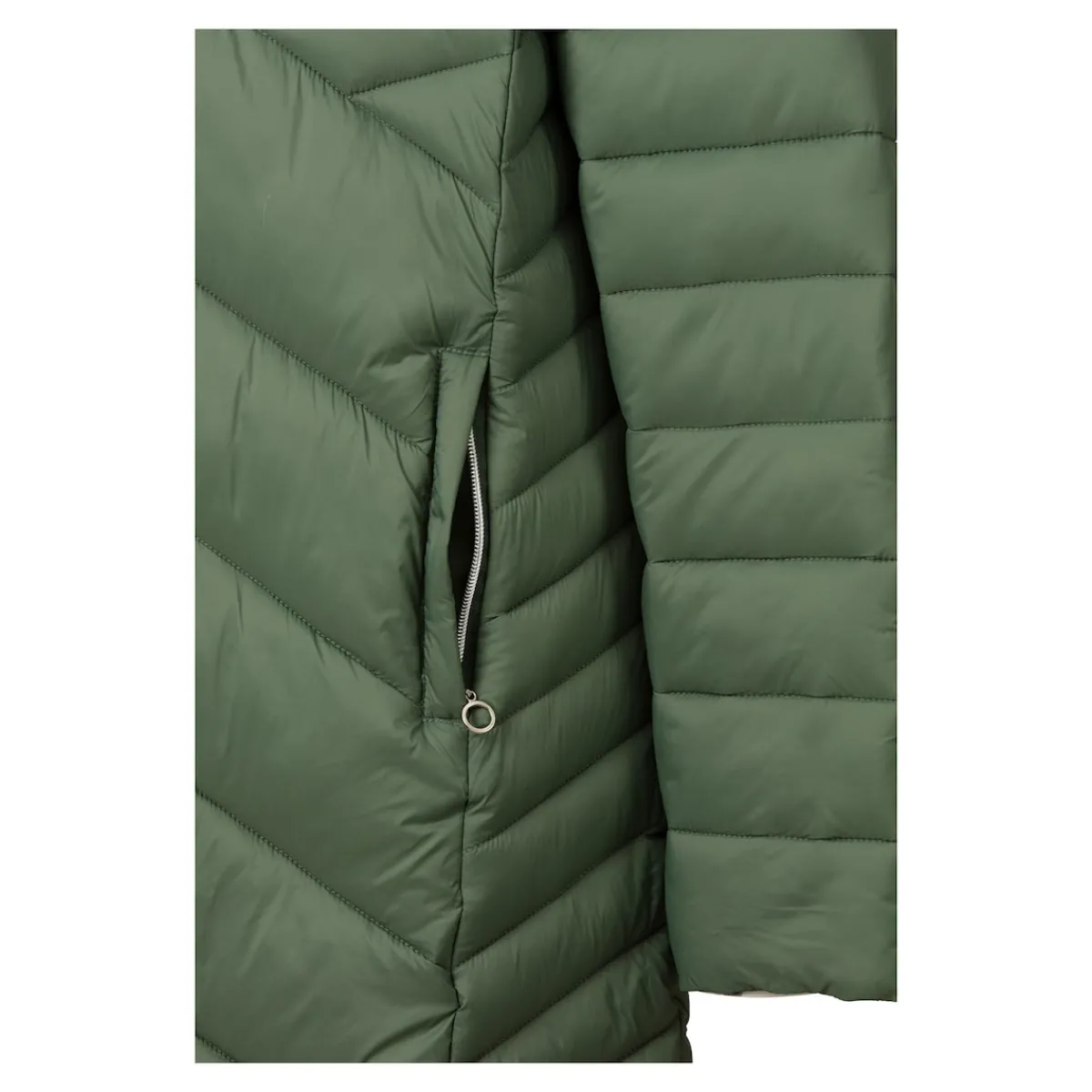 Mit seiner warmen Kapuze schützt der Mantel Sie zuverlässig vor Wind und Wetter. Die geometrischen Steppnähte sorgen dabei für eine schlanke Silhouette, während die Wattierung Sie auch an kalten Tagen angenehm warmhält. Ein schickes Detail: der farblich abgesetzte Reißverschluss, der auch an den praktischen Seitentaschen zu finden ist.