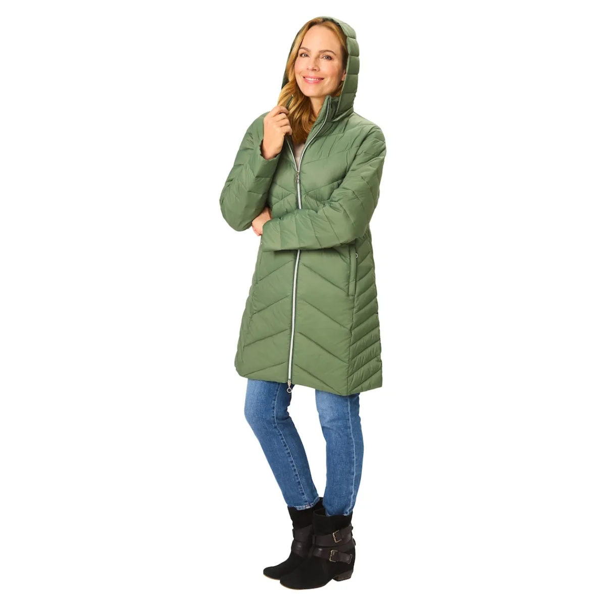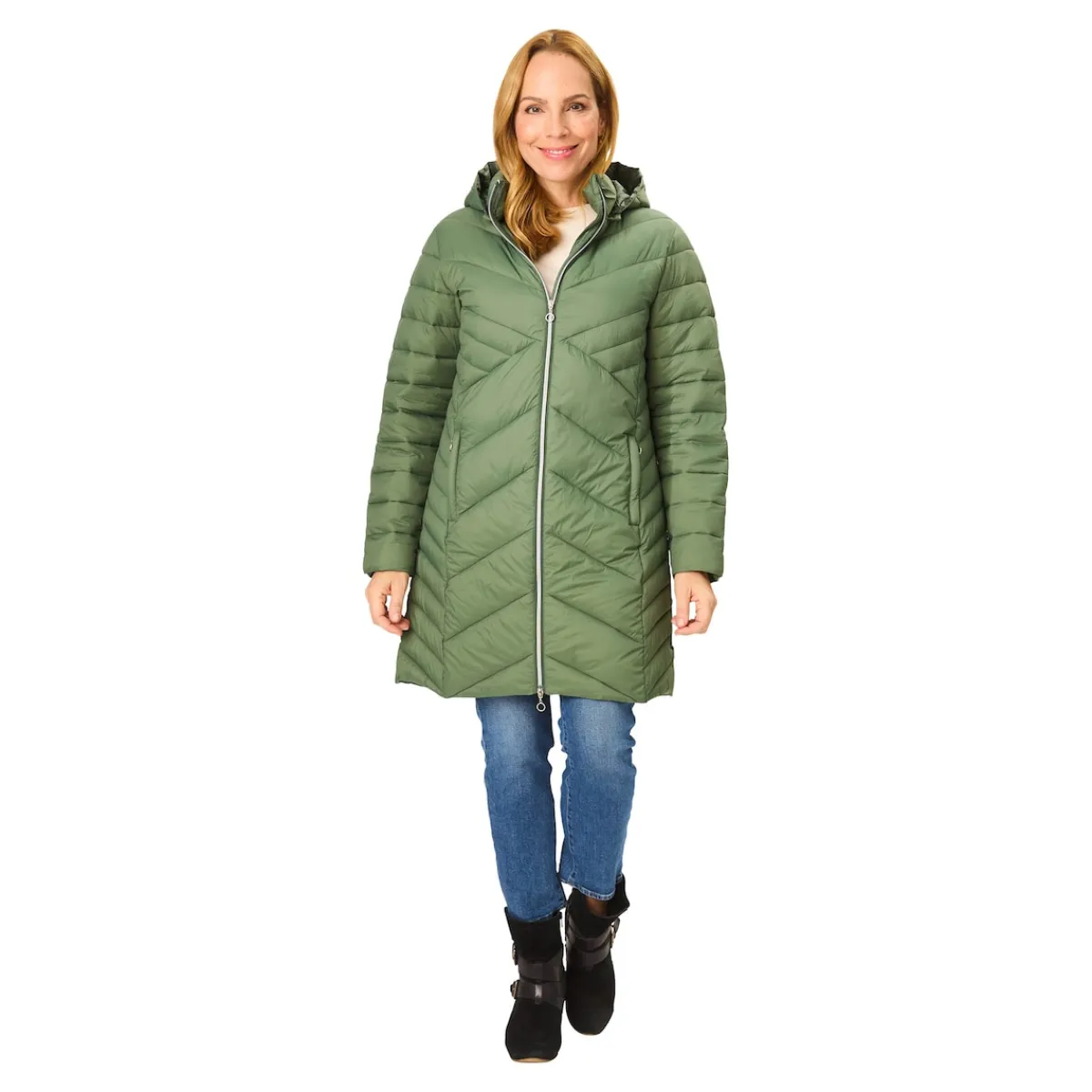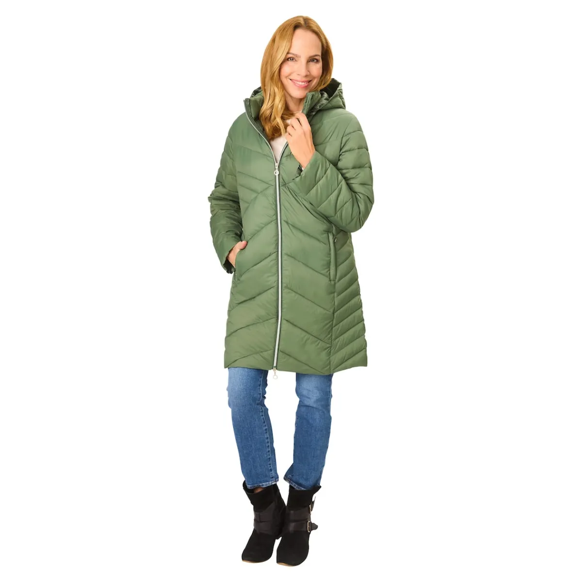 Mit seiner warmen Kapuze schützt der Mantel Sie zuverlässig vor Wind und Wetter. Die geometrischen Steppnähte sorgen dabei für eine schlanke Silhouette, während die Wattierung Sie auch an kalten Tagen angenehm warmhält. Ein schickes Detail: der farblich abgesetzte Reißverschluss, der auch an den praktischen Seitentaschen zu finden ist.