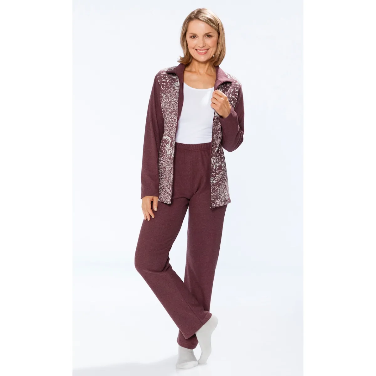 Modisch gemustertes Oberteil mit Klappkragen und durchgehendem Reißverschluss. Hose in bequemer Weite mit elastischem Bund. Innen angeraute, superweiche Qualität. Ärmel, Kragen und Hose unifarben.