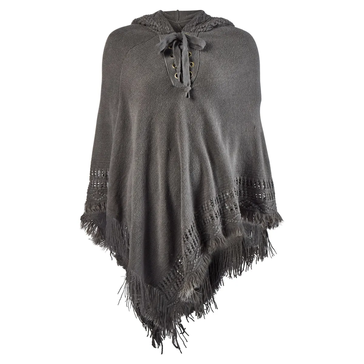 Pullover-Alternative, Jacke, wärmendes Accessoire – Ponchos sind wunderbar vielseitig! Dieses Exemplar überzeugt mit Kapuze, dekorativem Verschluss, Abschlussborte, lässigen Fransen und effektvoller Schnürung. Einheitsgröße, Rückenlänge: 100 cm.