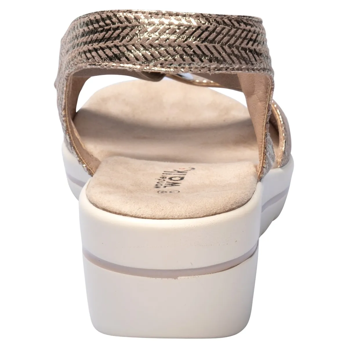 Mit dieser leichten Sandale gehen Sie eleganten Fußes durch die warme Jahreszeit. Der bequeme Keilabsatz von 5 cm und das elastische Band sorgen für einen perfekten Tragekomfort – kombiniert mit der edel-schimmernden Flecht-Optik einfach unschlagbar.