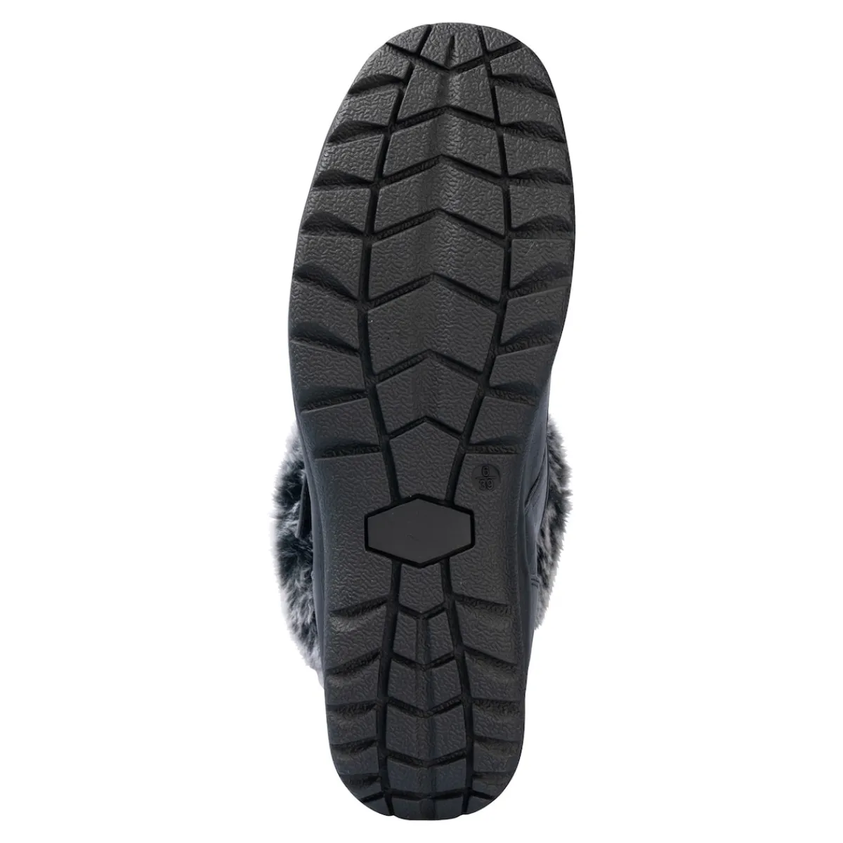 Die kuschelig warm gefütterte Stiefelette mit üppigem Kunstpelzrand lässt sich dank breitem Klettverschluss optimal an Ihren Fuß und stärkere Waden anpassen. Praktisch: Die Stiefelette lässt sich weit öffnen und bietet Ihnen dadurch einen leichten Ein- und Ausstieg. Mit weicher Decksohle, rutschhemmender Laufsohle und einer bequemen, durchgehenden Absatzhöhe.
