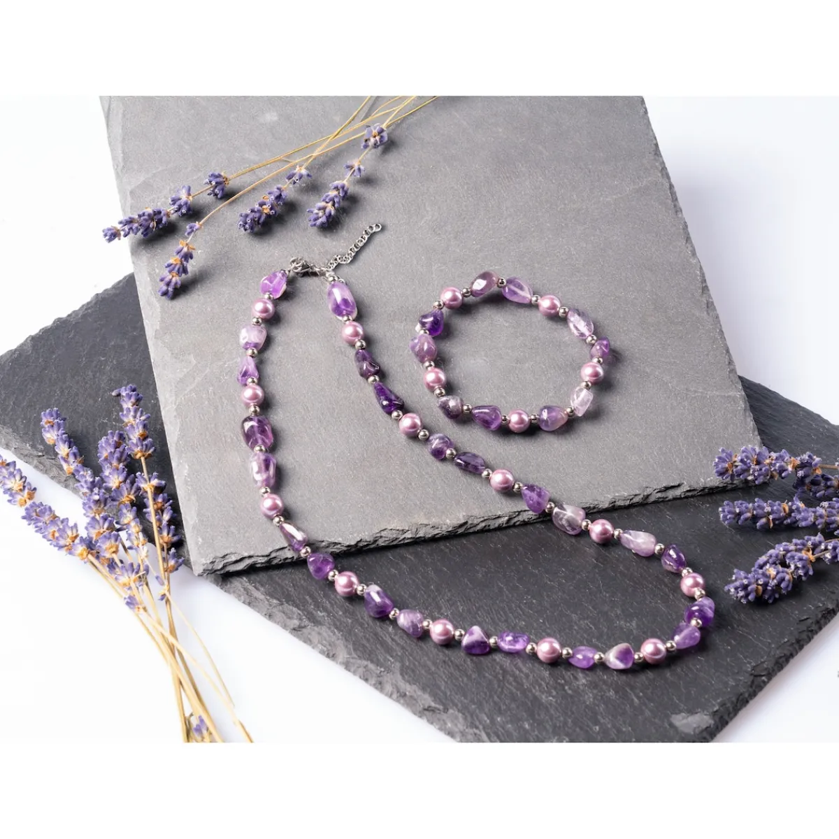 Diese stilvolle Kette vereint edle Materialien mit einer besonderen Wirkung. Die Kombination aus Amethyst-Quarzen, schimmernden Muschelkernperlen und versilberten Zwischenkugeln ergibt ein harmonisches Gesamtbild. Der Amethyst wird traditionell als „Stein der Ruhe“ geschätzt und soll helfen, Stress zu lindern und innere Ausgeglichenheit zu fördern. Dank des kleinen Karabiners lässt sich die Kette flexibel in der Länge verstellen (43 + 5 cm) – für eine perfekte Passform mit Stil und Bedeutung.