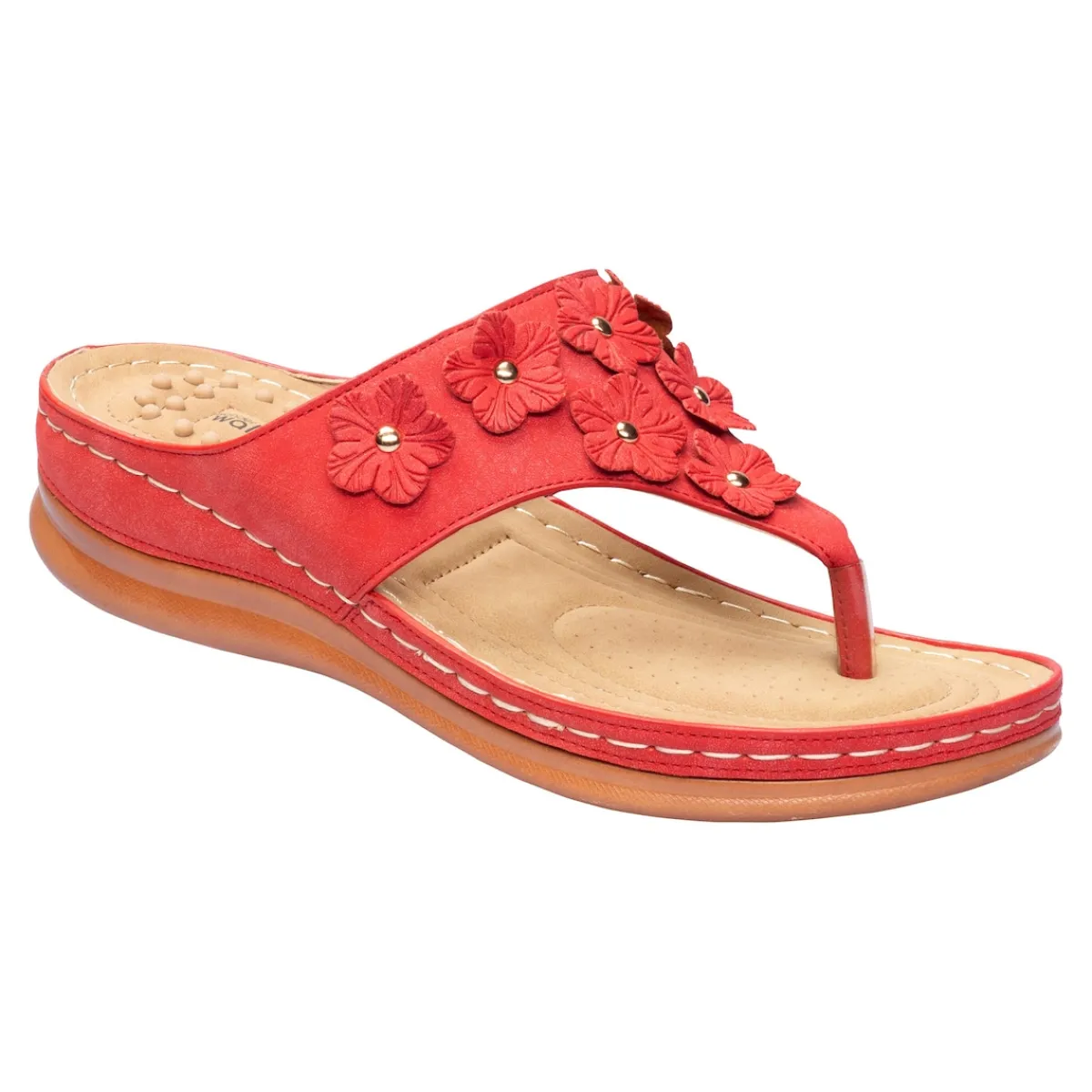 Mit dieser sommerlich-leichten Pantolette gehen Sie leichtfüßig und stilvoll durch die warme Jahreszeit. Das weiche Fußbett mit Noppen sorgt beim Gehen für eine sanfte Massage – einfach herrlich. Mit glänzenden Metall-Applikationen, bequemer Laufsohle und einem Keilabsatz von 4,5 cm.