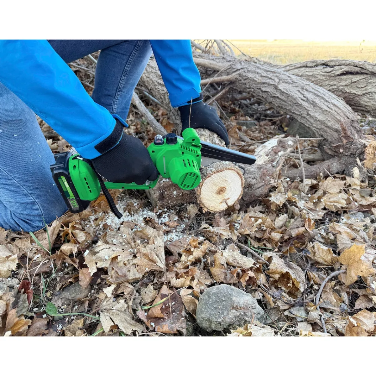 Ob im Garten, in der Werkstatt oder bei Heimwerker-Projekten – mit dieser kraftvollen, kabellosen Mini-Kettensäge arbeiten Sie flexibel und präzise. Das 14 cm Sägeschwert meistert Äste, Sträucher, Reben, Brennholz oder Bretter mit einem Durchmesser bis zu 15 cm mühelos. Dank werkzeuglosem Schnellspannsystem lässt sich die Sägekette unkompliziert wechseln, während die integrierte Ölpumpe für eine langlebige und reibungslose Laufleistung sorgt (Öl nicht enthalten).