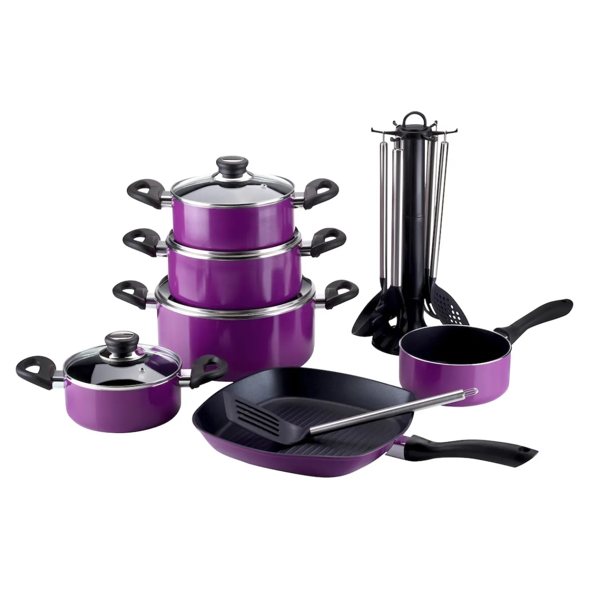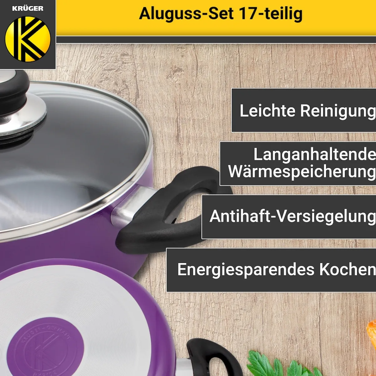 Das 17-teilige Aluguss-Topfset macht gesundes Kochen zum Kinderspiel. Die Töpfe und die Steakpfanne bestehen aus robustem Aluguss und sind mit komfortablen Kunststoffgriffen ausgestattet. Dank der hochwertigen Antihaft-Beschichtung benötigen Sie nur wenig Fett, was Ihre Gerichte besonders gesund macht. Die schwere Qualitätsausführung sorgt für eine optimale Wärmeverteilung und langanhaltende Wärmespeicherung. Die Töpfe sind hitzebeständig bis 180°C (mit Deckel bis 160°C) und spülmaschinenfest, was die Reinigung erleichtert. Zusätzlich enthält das Set sechs praktische Küchenhelfer und einen Ständer, die Ihnen die Zubereitung Ihrer Gerichte erleichtern. Geeignet für alle Herdarten außer Induktion.