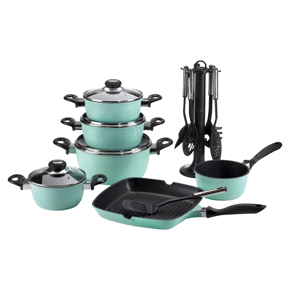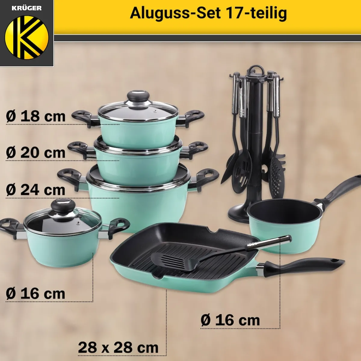 Das 17-teilige Aluguss-Topfset macht gesundes Kochen zum Kinderspiel. Die Töpfe und die Steakpfanne bestehen aus robustem Aluguss und sind mit komfortablen Kunststoffgriffen ausgestattet. Dank der hochwertigen Antihaft-Beschichtung benötigen Sie nur wenig Fett, was Ihre Gerichte besonders gesund macht. Die schwere Qualitätsausführung sorgt für eine optimale Wärmeverteilung und langanhaltende Wärmespeicherung. Die Töpfe sind hitzebeständig bis 180°C (mit Deckel bis 160°C) und spülmaschinenfest, was die Reinigung erleichtert. Zusätzlich enthält das Set sechs praktische Küchenhelfer und einen Ständer, die Ihnen die Zubereitung Ihrer Gerichte erleichtern. Geeignet für alle Herdarten außer Induktion.