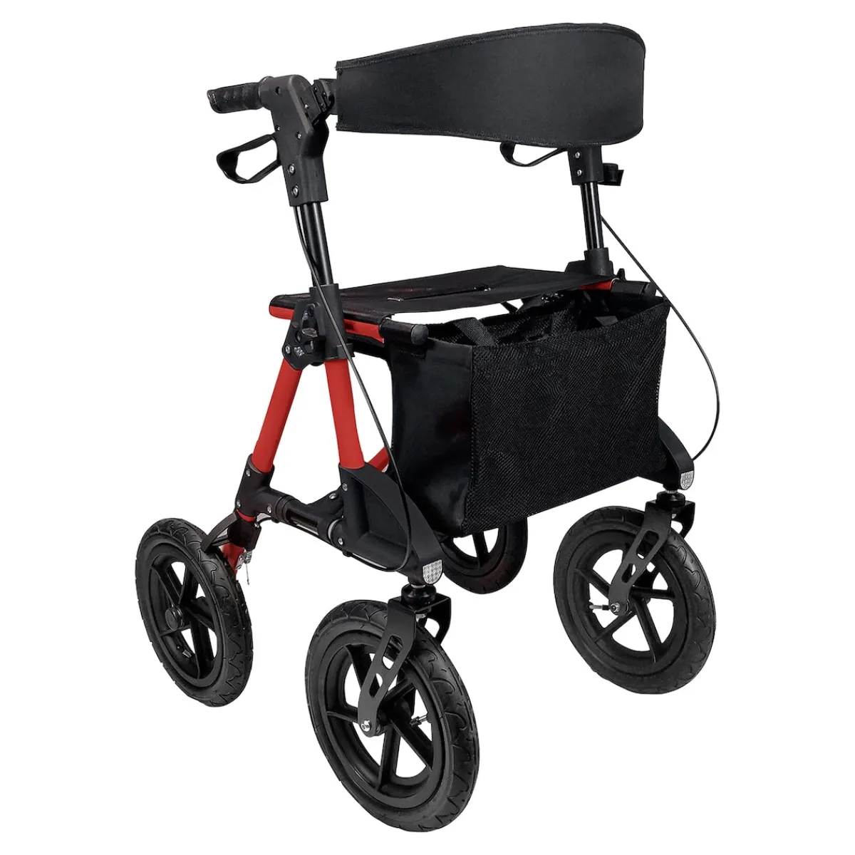 Einen besonders sicheren Halt bieten die in Stufen verstellbaren ergonomischen Griffe und die extra-großen Räder mit Luftbereifung und Profil, die so manche Unebenheit ausgleichen können. Die Ankipphilfe hilft beim Überwinden von Hindernissen und die Feststell- und Betriebsbremse für einen sicheren Stopp, wenn Sie eine Pause einlegen möchten. Dann können Sie es sich auf dem 61 cm hohen Sitz bequem machen und ein Weilchen ausruhen, bevor Sie Ihren Weg fortsetzen. Der 60 cm lange Rückengurt bietet hierbei eine gute Stütze.