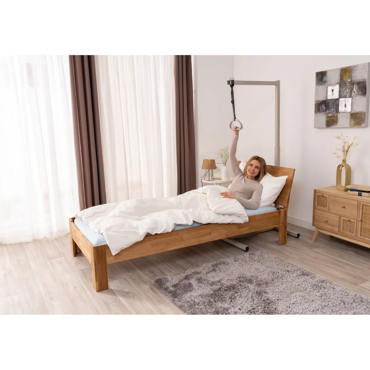 Mit dieser Aufrichthilfe können Sie sich auch im Krankheits- oder Pflegefall sicher im eigenen Bett aufrichten. Sie unterstützt beim Aufrichten aus einer liegenden in eine sitzende Position, hilft aber ebenso beim Anheben des Gesäßes, um eine Bettpfanne zu verwenden. Auch kann der 176 cm hohe Bettgalgen als Sicherungshilfe beim Umsetzen vom Bett in einen Roll- oder Toilettenstuhl dienen. Die Griffhöhe lässt sich an dem Gurt einstellen (1,24 bis 1,33 m vom Boden aus) und damit an die eigene Körpergröße anpassen.