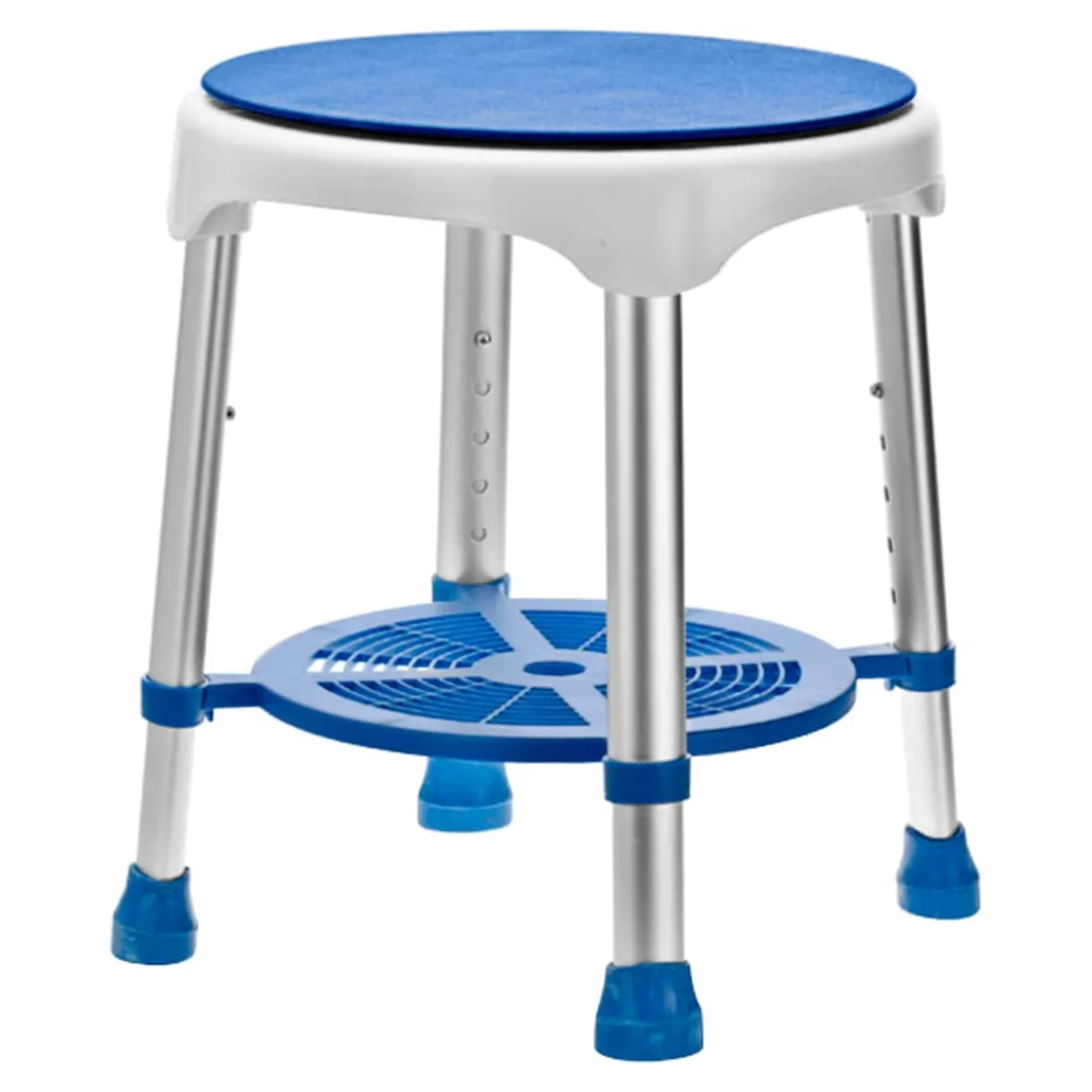 Ideal, wo wenig Platz ist. Gepolsterte Sitzfläche, darunter praktische Ablage für Pflegemittel. Einfach zu reinigen. Aus Aluminium und Kunststoff, mit rutschfesten Gummifüßen.