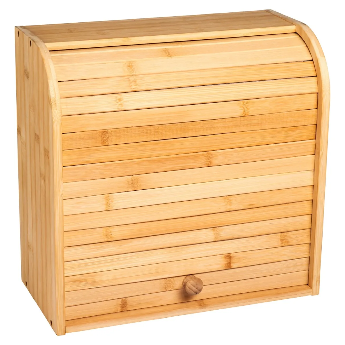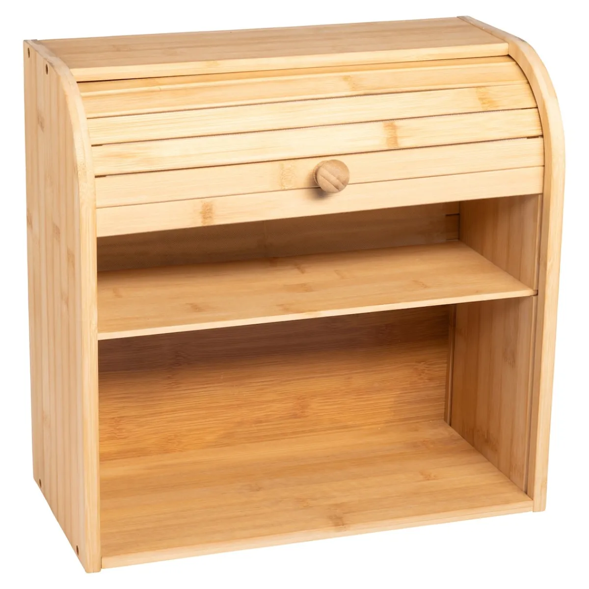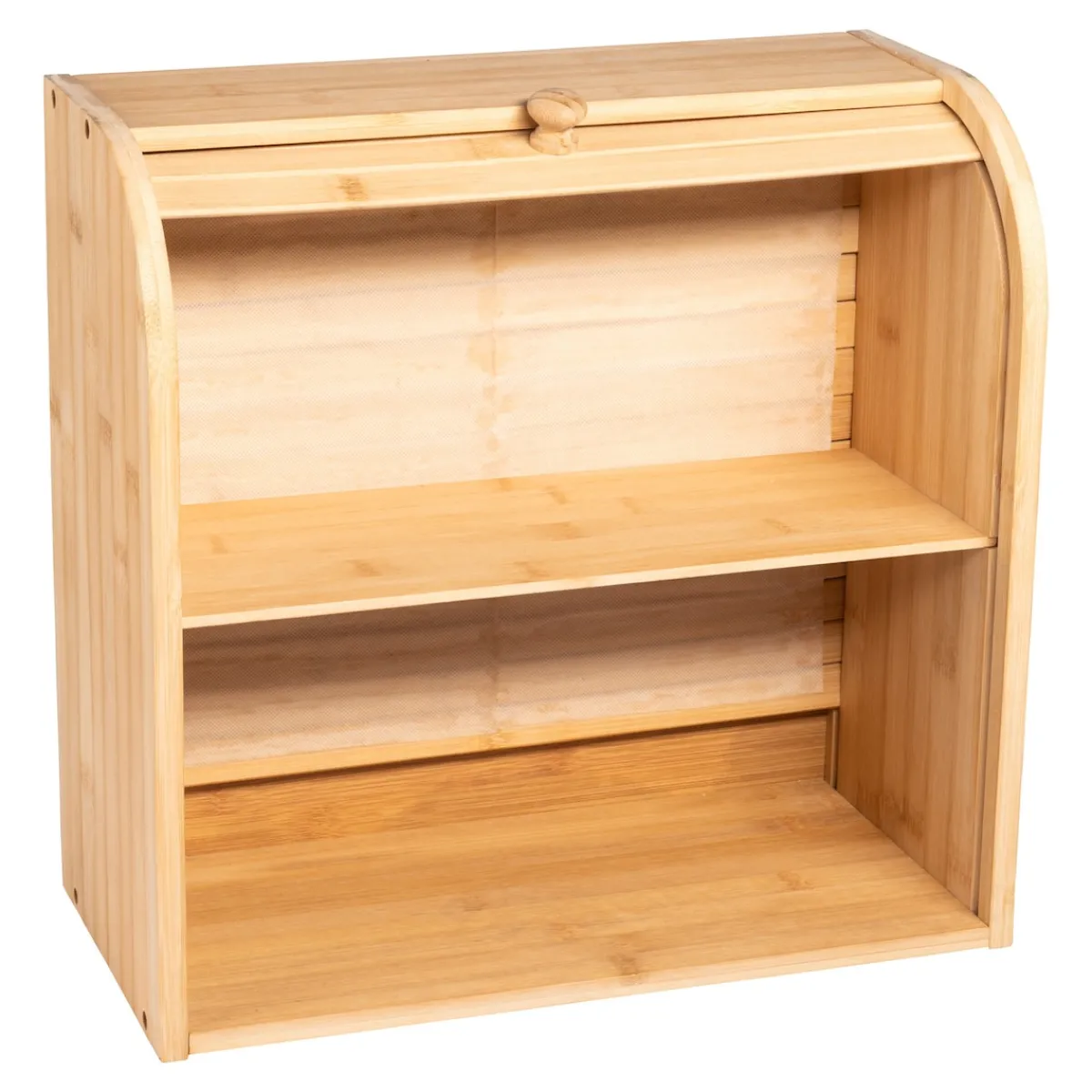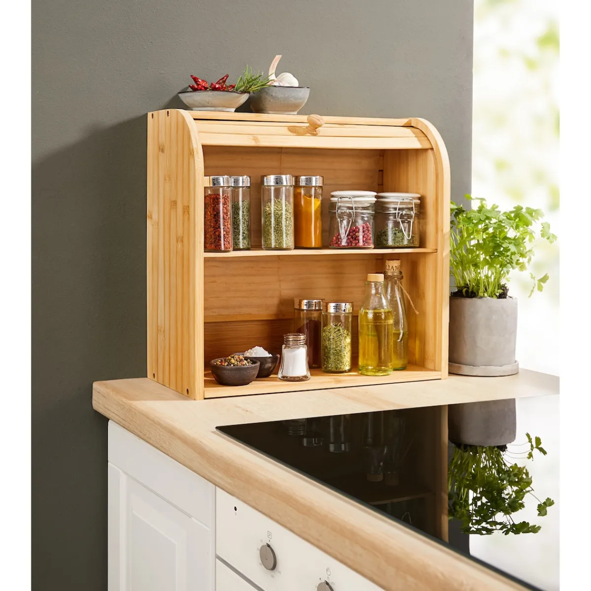 Das hochwertige Regal aus langlebigem Bambus bietet in 2 Fächern viel Platz für Backwaren, Gewürze und viele andere Dinge. Der leichtgängige Rollladen ermöglicht ein einfaches Entnehmen und Befüllen des Gebäcks und hält dieses länger frisch.