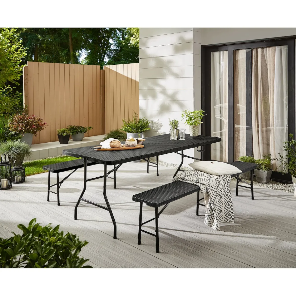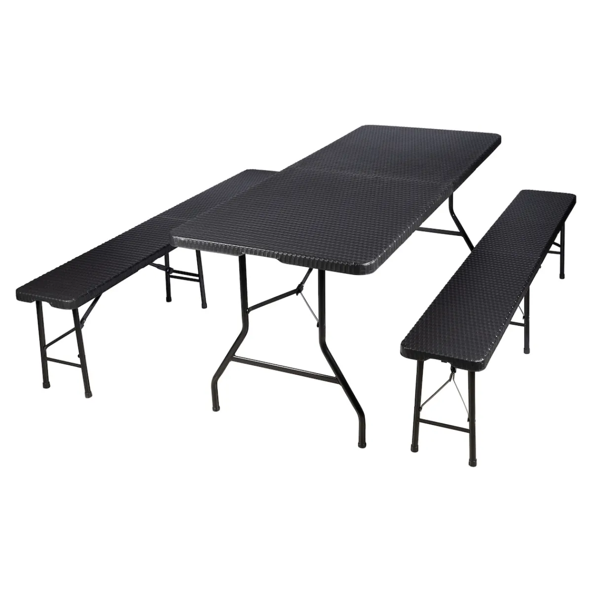 Ein weiterer Vorteil ist die platzsparende Klappfunktion. Nach dem Fest lässt sich die Garnitur mühelos zusammenklappen und findet sogar in kleinen Kofferräumen Platz. Die robusten Stahlrohre sorgen für Stabilität, während der wetterfeste Kunststoff langlebig und pflegeleicht ist.