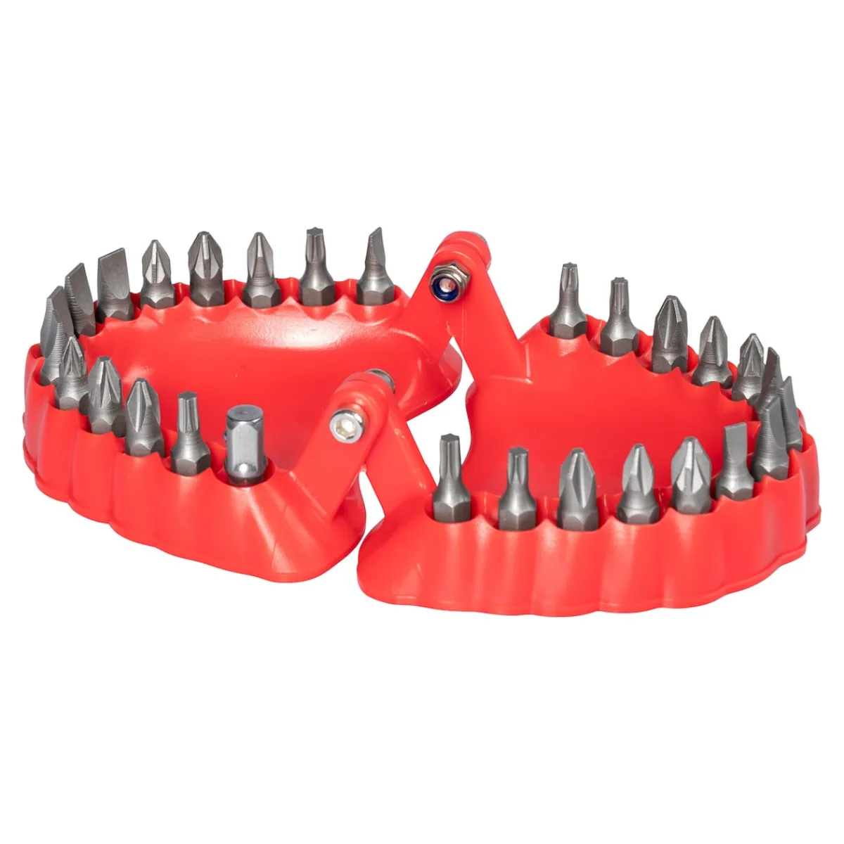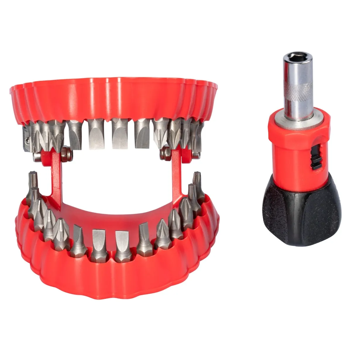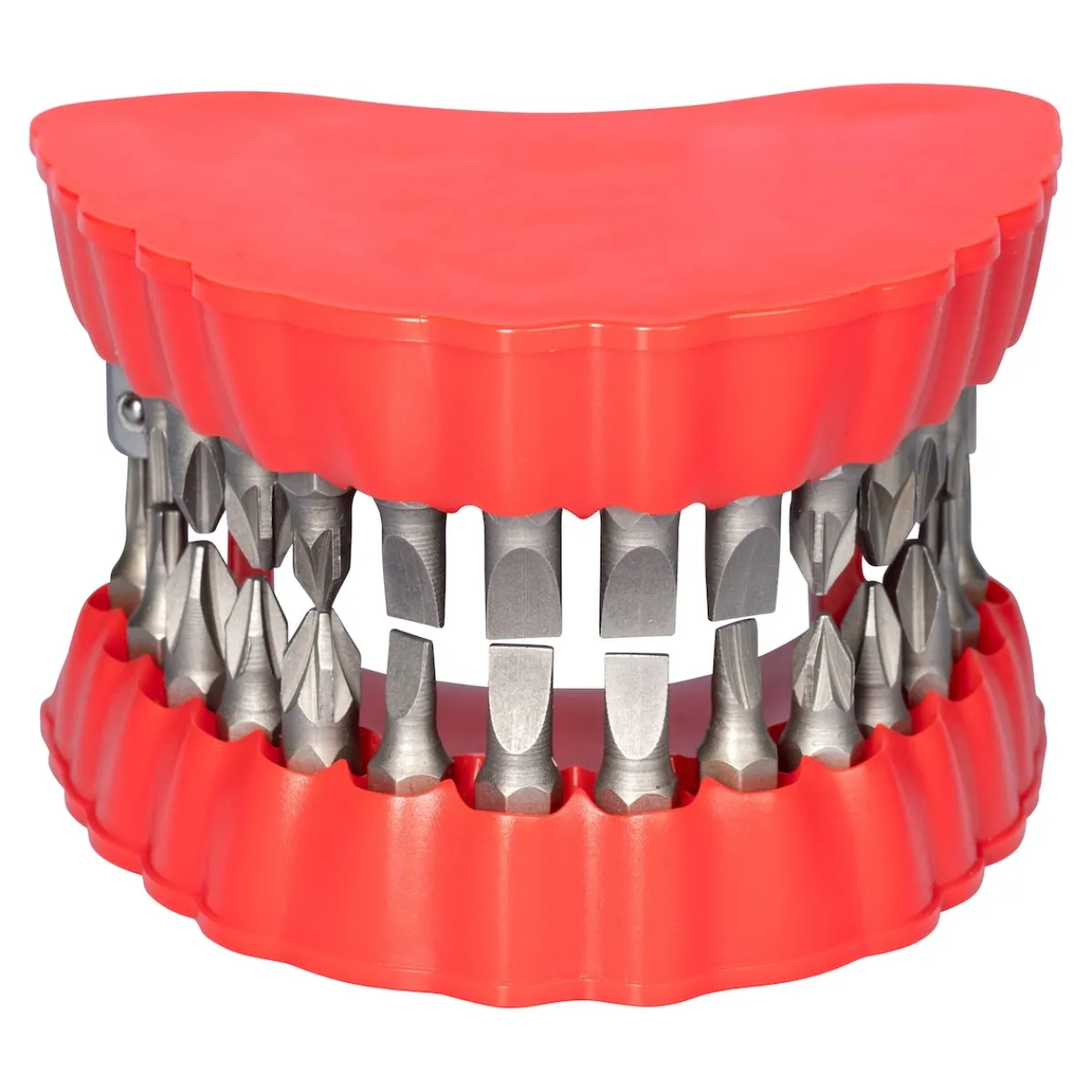 Die Aufbewahrungsbox in Form einer witzigen Prothese hat Platz für 2x 14 verschiedene hochwertige „Beißerchen“. Den gewünschten Bit einfach entnehmen und auf den Schraubendreher stecken – los geht’s!