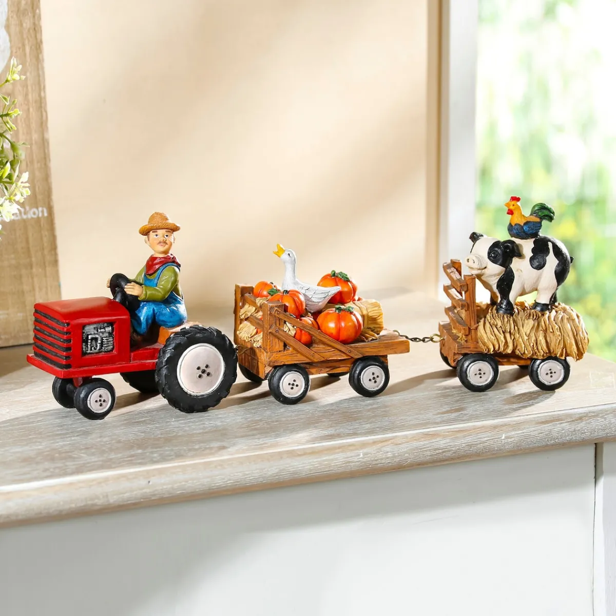 Herbstzeit – Erntezeit. Reichhaltig geht es zu, wenn Bauer Anton mit seinem Traktor einfährt. Ein Anhänger ist beladen mit Kürbissen und einer Gans, der andere mit Huhn und Schweinchen. Mit einer Gesamtlänge von 37 cm macht der Ernte-Zug auch draußen im Garten einen stattlichen Eindruck, zumal er aus Kunststein und somit wetterfest ist. Anhänger jeweils mit Kettenglied verbunden; nicht abnehmbar