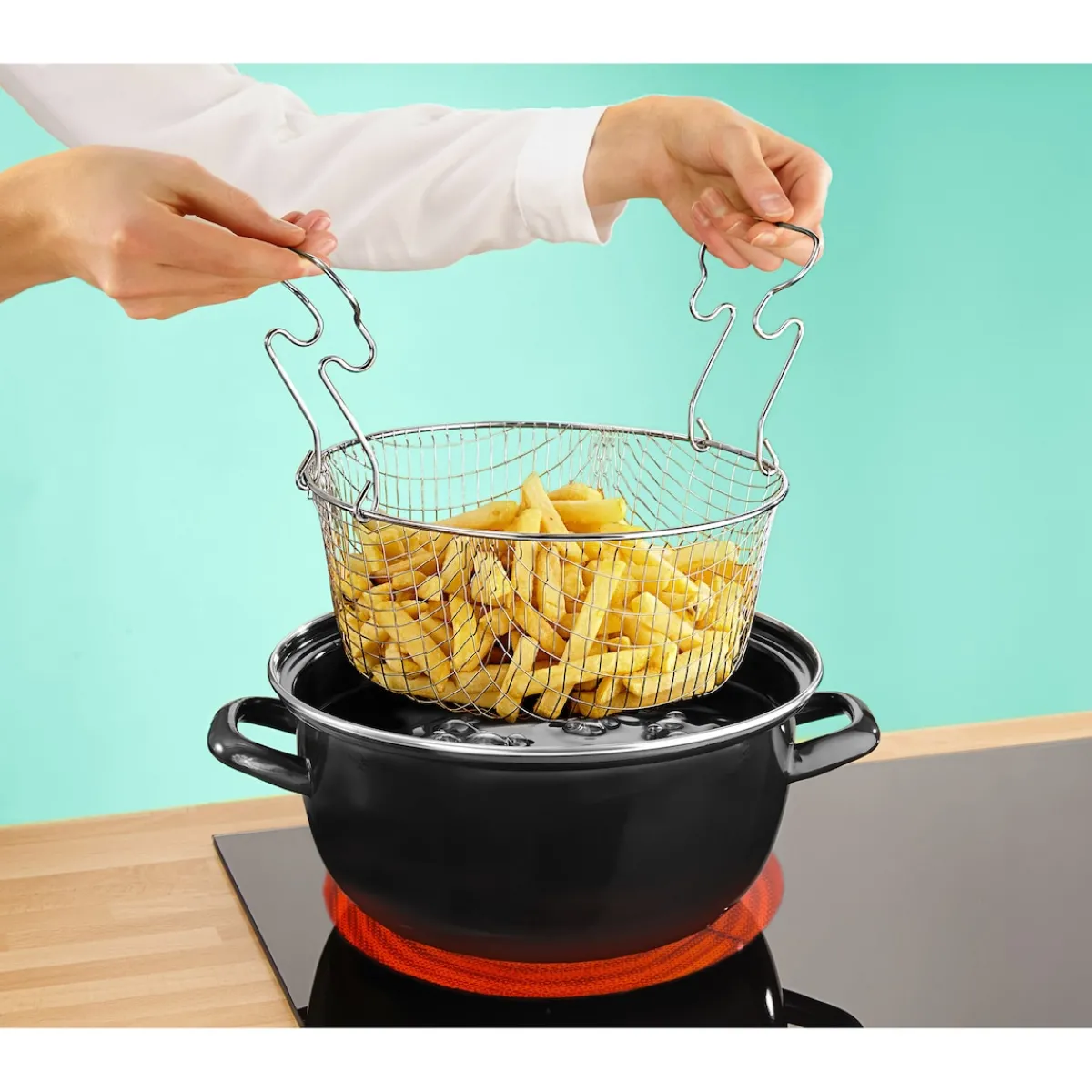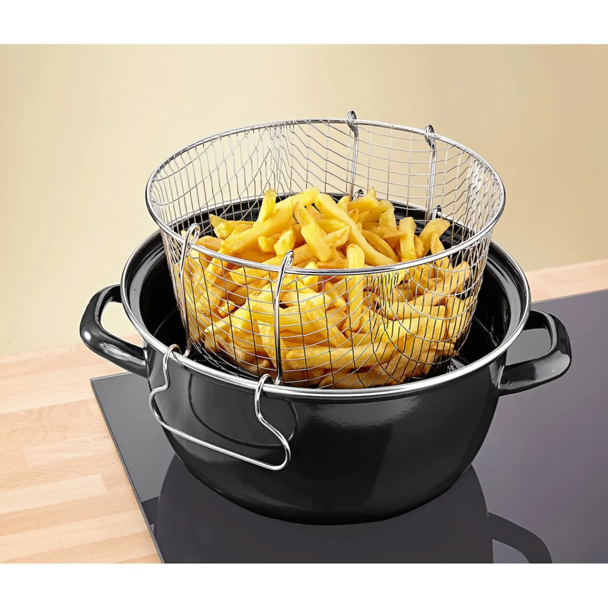 Clever: Der Emaille-Frittiertopf von KRÜGER ist eine platzsparende Alternative zu elektrischen Fritteusen. Dank Siebeinsatz können Sie Pommes, Nuggets und andere Köstlichkeiten in siedendem Fett knusprig frittieren und danach einfach abtropfen lassen.