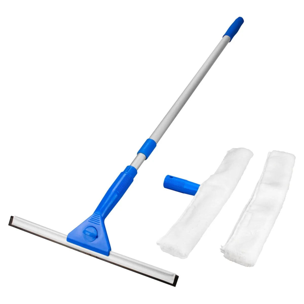 Größere Glasflächen und Fenster reinigen Sie mühelos mit diesem Set. Bestücken Sie den Stiel je nach Bedarf: Fensterwischer plus weicher Waschbezug oder Abzieher mit anschmiegsamer Gummilippe! Durch den Teleskopstiel (ausziehbar von 54 – 91 cm) erreichen Sie auch höher gelegene Stellen ganz bequem. Waschbar bis 40 °C.