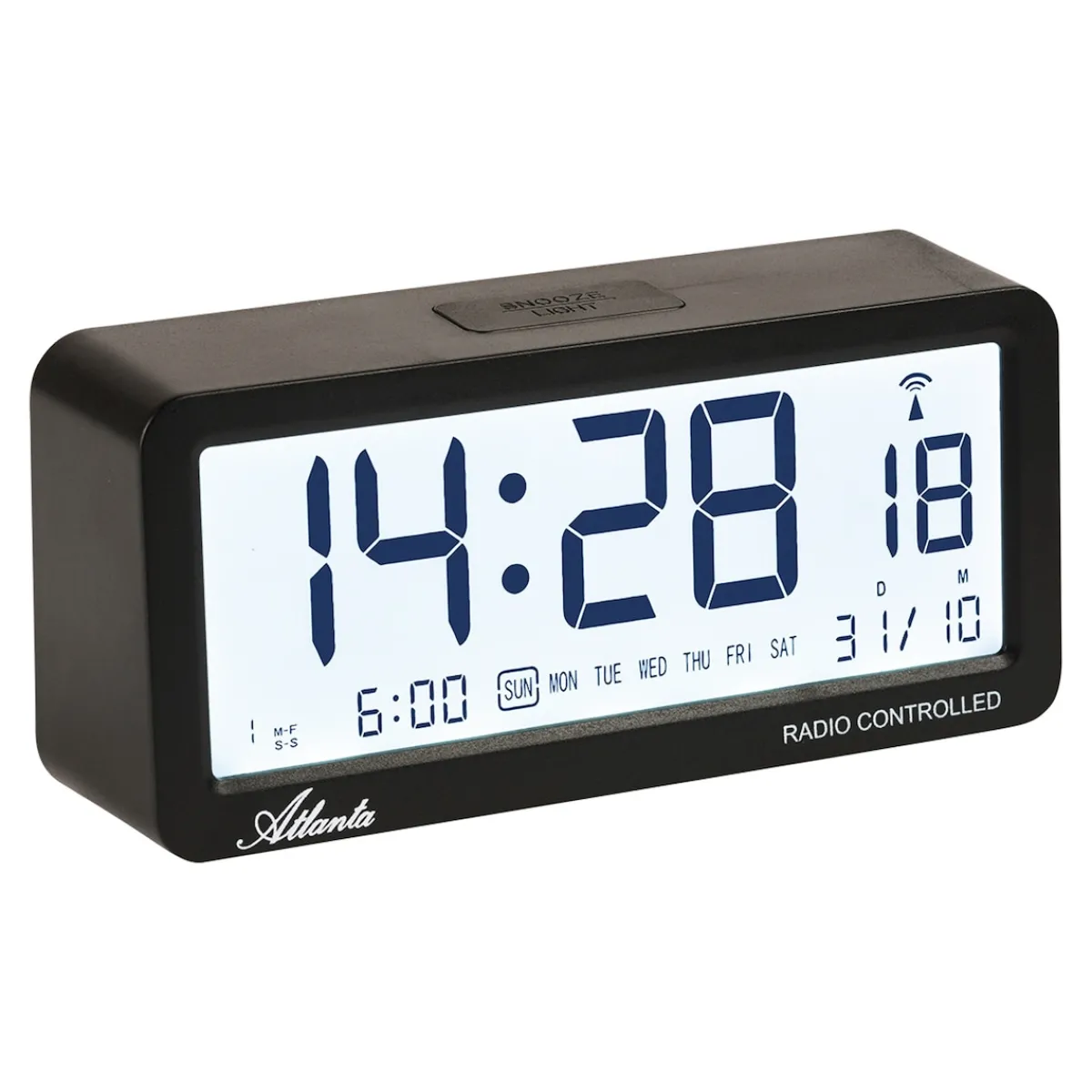 3 Weckzeiten wählbar, spezieller Nachtleuchteffekt. Mit Anzeige von Wochentag und Datum.