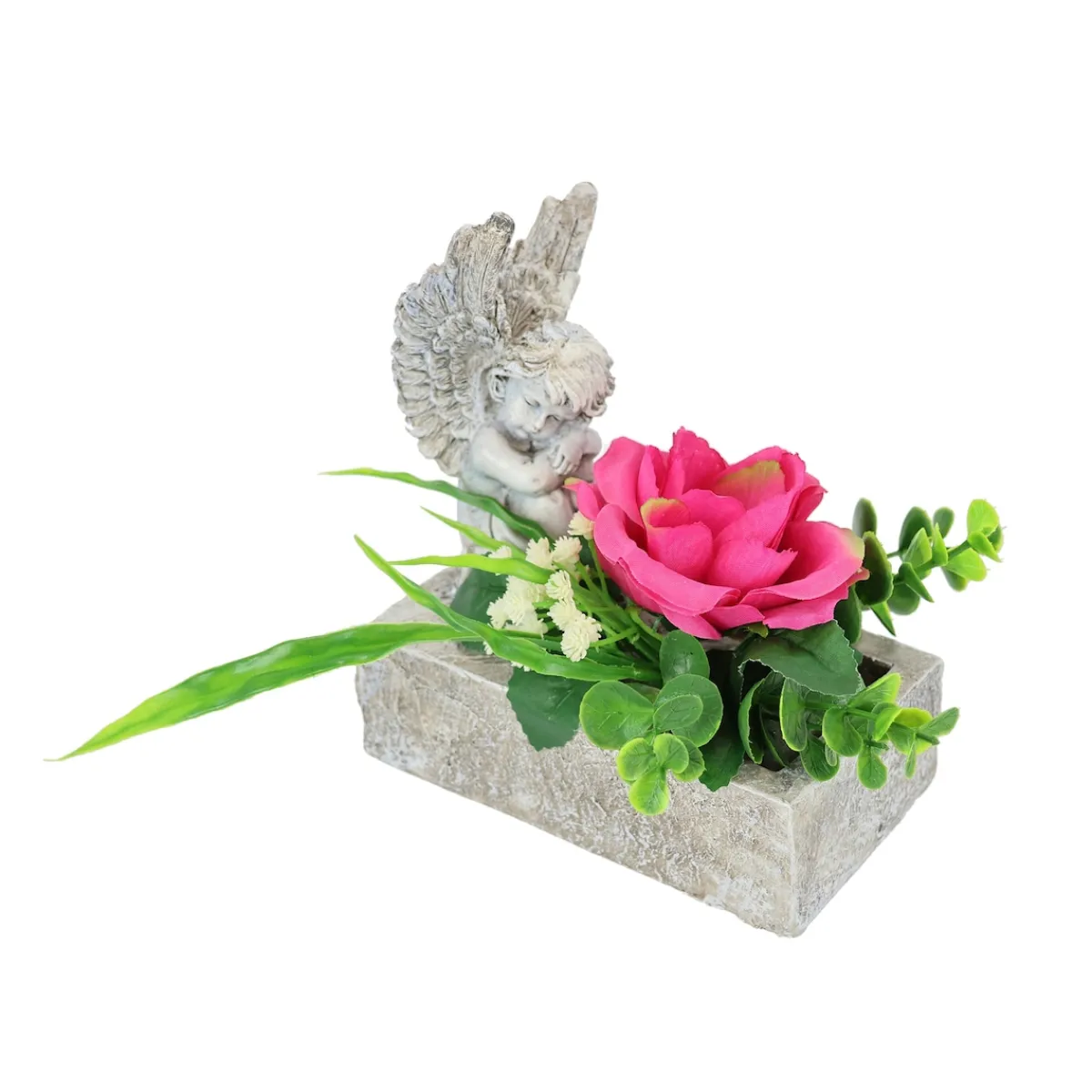 Unser Grabgesteck mit einem Engel ist ein schöner Ausdruck des Gedenkens. Es kombiniert eine prächtige Rose mit feinem Beiwerk aus Eukalyptus und Schleierkraut und verleiht dem Gesteck eine zeitlose Eleganz. Das Blumengesteck ist fest in eine Schale gesetzt, auf deren Rand ein filigraner Engel aus wacht. Die hochwertige, wetterfeste Konstruktion sorgt für Beständigkeit im Freien.