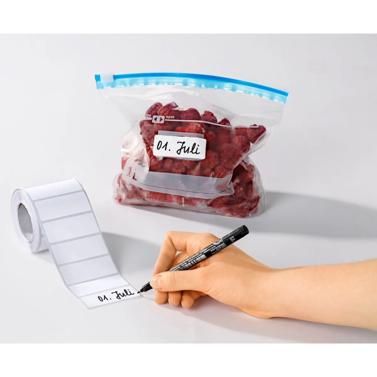 Die Haushaltsetiketten sind eine einfache und praktische Lösung zur Beschriftung aller Behälter im Haushalt oder Büro. Die Etikettenrolle benötigt nicht viel Platz und lässt sich leicht in einer Schublade oder einem Fach im Schreibtisch, Regal oder Küchenschrank aufbewahren. Auf der Rolle befinden sich 500 Etiketten, die mit jedem Stift beschriftet werden können, ohne zu verschmieren. Sie lassen sich leicht von der Rolle entfernen und kleben auch nach Jahren noch gut. Nach dem Gebrauch können die Haftetiketten von allen Materialien wie Kunststoff, Glas, Holz oder Metall einfach und ohne Beschädigungen wieder entfernt werden.