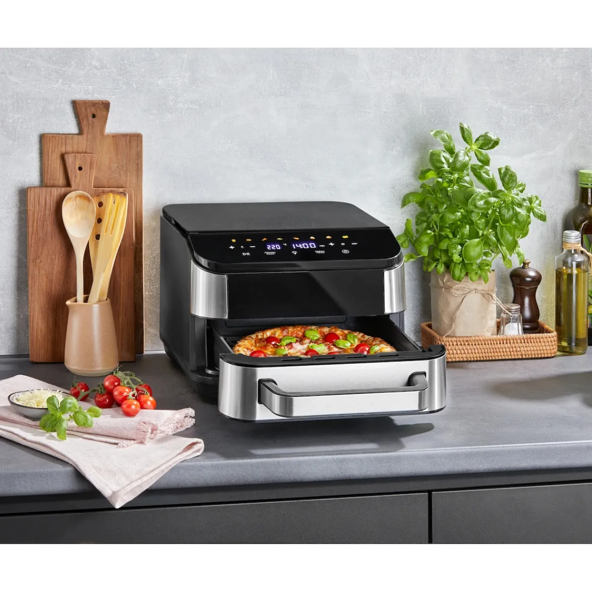 Knuspriger Genuss im Handumdrehen – diese Heißluftfritteuse spart Zeit und Energie, ohne Kompromisse bei Geschmack oder Biss. Ideal für alle, die clever und gesund genießen möchten! Mit extra großer Schublade für krosse XXL-Portionen, zum Aufbacken einer Tiefkühlpizza & Co.