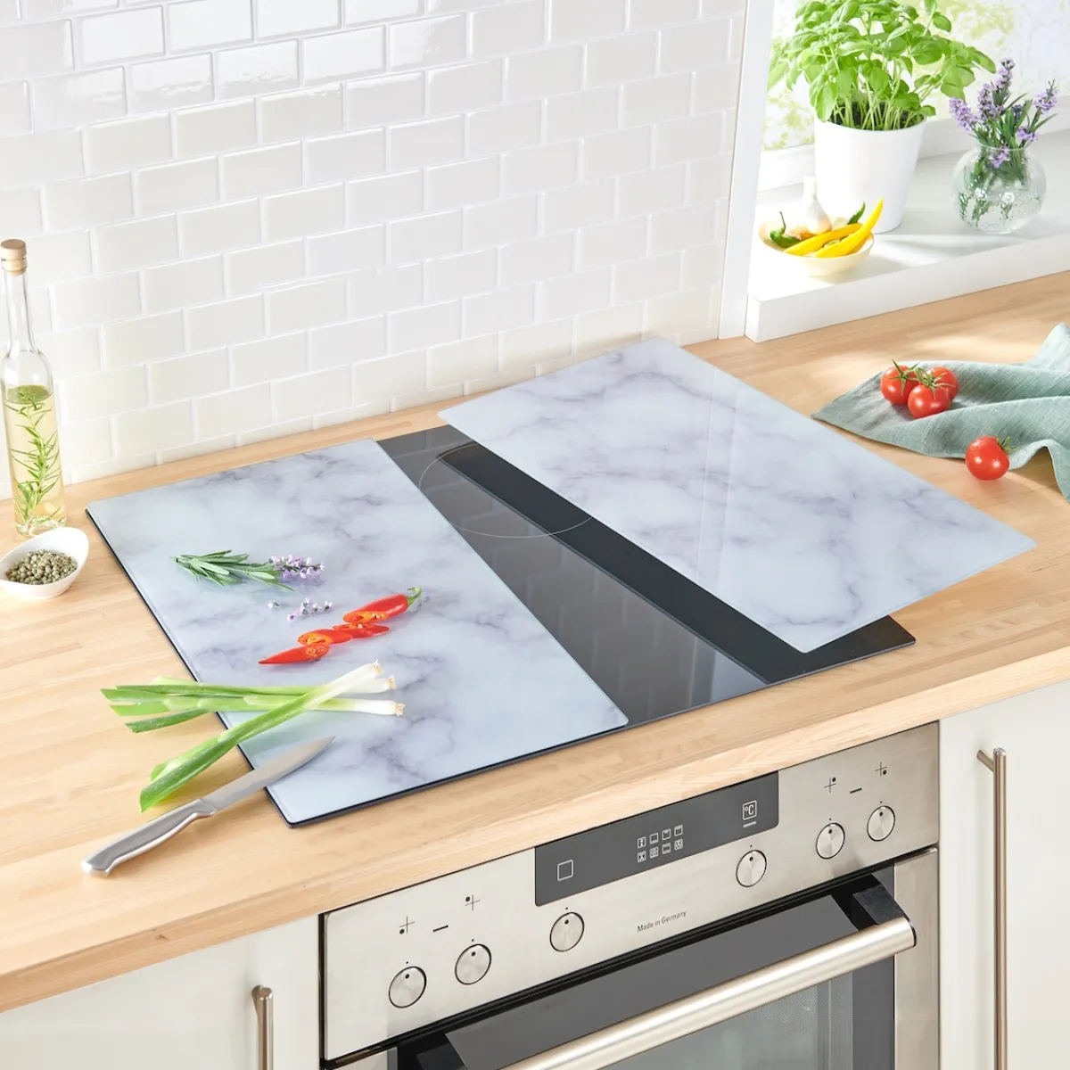 Diese Herdabdeckplatten können mehr als nur glänzen: Das edle Marmor-Design verwandelt Ihre Küche in ein echtes Gourmet-Paradies. Einsetzbar als stilvoller Schutz vor Beschädigungen oder als robustes Schneidebrett für all Ihre Küchenabenteuer. Mit rutschhemmenden Gummifüßchen.