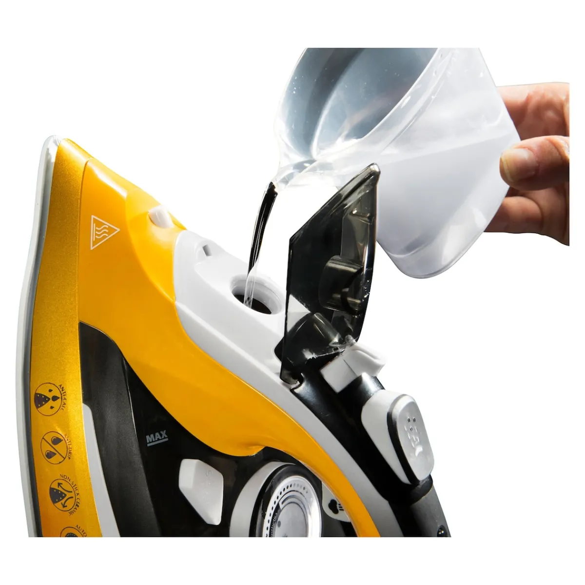 Das Bügeleisen mit der auffälligen Farbgebung in Gold-Schwarz ist nicht nur optisch ein echter Hingucker, sondern kann auch durch seine Funktion überzeugen. Als 2-in-1-Gerät ist es sowohl Bügel- als auch Dampfglätter-System und kann je nach Bedarf die eine oder andere Aufgabe erfüllen.