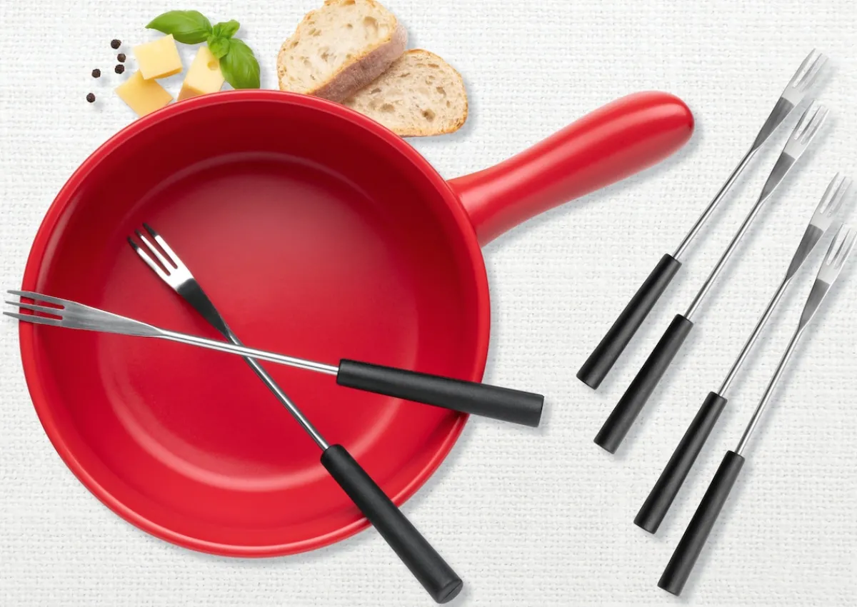 Bestehend aus: Fonduetopf (Ø 22,5 cm, 2,6 l), Fonduebrenner, Rechaud, Bodenplatte, Zwischenlage und 6 Fonduegabeln