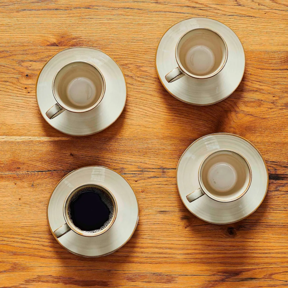 Moderner Brit-Chic für Ihren Esstisch – dieses Versprechen löst die Serie „Nottingham“ der österreichischen Traditionsmarke MÄSER perfekt ein: Aufwändig gefertigt aus hochwertigem Steinzeug, designed um eine aufregende Brücke zwischen Retro- und modernem Look zu schlagen. Neben seinem grundlegend unvergleichlichen Charakter glänzt dieses Kaffeetassen Set mit Untertassen für 4 Personen nicht zuletzt auch dadurch, dass kein Teil exakt wie das andere aussieht. Eine händisch aufgetragene reaktive Glasur und organische Formen anstelle von perfekten Rundungen sind hierfür ausschlaggebend. Alle Teile sind spülmaschinen- und mikrowellengeeignet, und dadurch äußerst pflegeleicht. Dieses Tassenset wird in einer vielfach auf Bruchsicherheit getesteten Verpackung aus ressourcenschonenden Materialien versendet. Im Sinn einer objektiven Vergleichbarkeit gehen unsere Füllmengenangaben von einer randvollen Befüllung aus. Bitte beachten Sie, dass durch die besondere Glasurtechnik alle Teile eine einzigartige Musterung aufweisen und farblich voneinander sowie vom abgebildeten Produkt abweichen können. Minimale Unebenheiten und kleine Einschlüsse in der Glasur können aufgrund des hohen handwerklichen Fertigungsanteils auftreten.