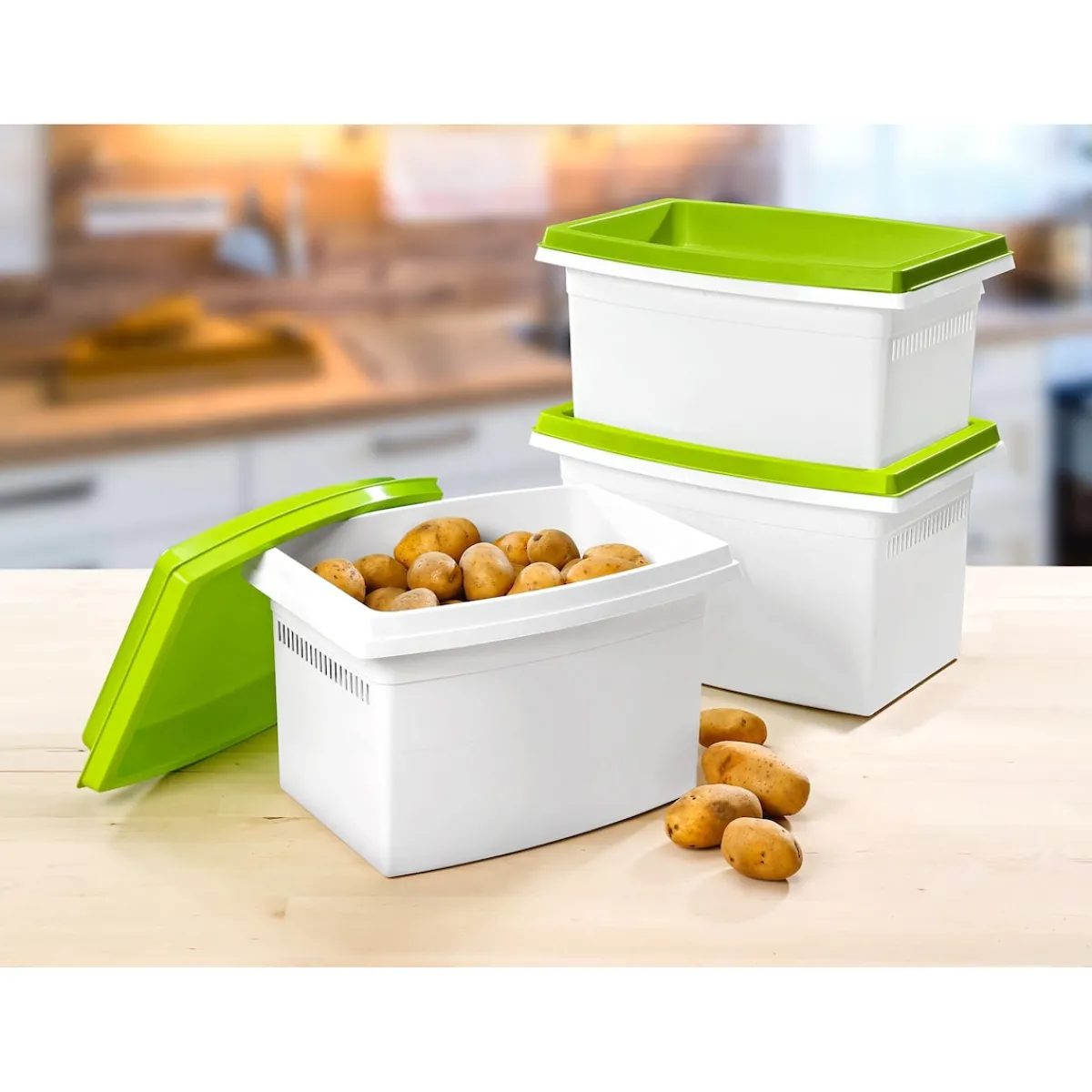 In eine Kartoffelbox passen bis zu fünf Kilogramm Inhalt. Das ist schon eine ganze Menge. Wer noch mehr Platz braucht oder unterschiedliches Obst und Gemüse getrennt voneinander lagern möchte, profitiert von den stapelbaren Eigenschaften der Box „Stapelbar“. Legen Sie einfach den jeweiligen Deckel auf und stapeln Sie eine Box über die andere. So sparen Sie Platz und haben dennoch jede Menge Lagermöglichkeiten für Kartoffeln, Obst und Gemüse.