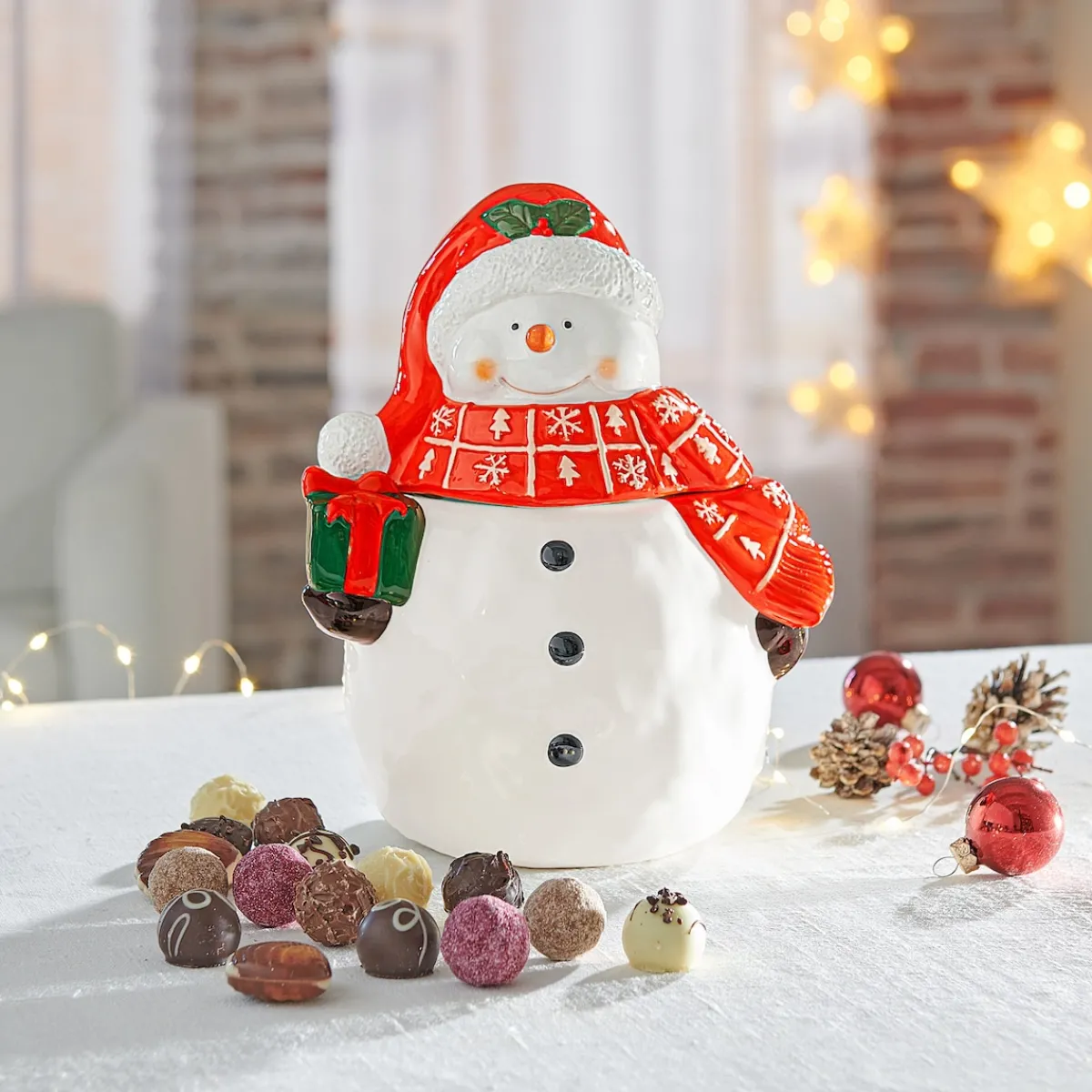 Hätten Sie‘s gedacht? Der süße Schneemann ist nicht nur ein dekorativer Blickfang, sondern tarnt sich auch gleichzeitig als Versteck für Süßigkeiten oder Kekse. Wer den Deckel abnimmt, findet vielleicht die ein oder andere Leckerei.