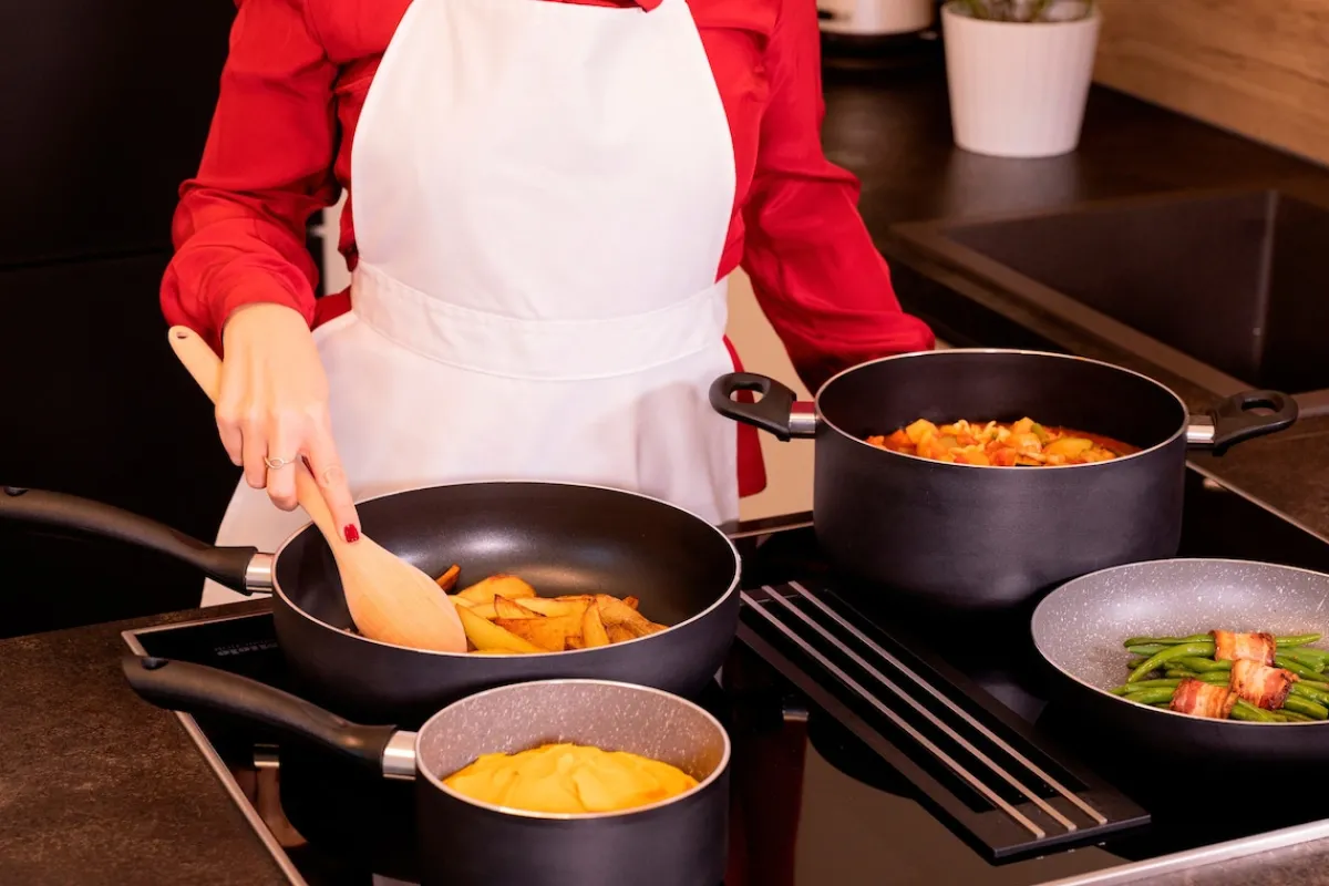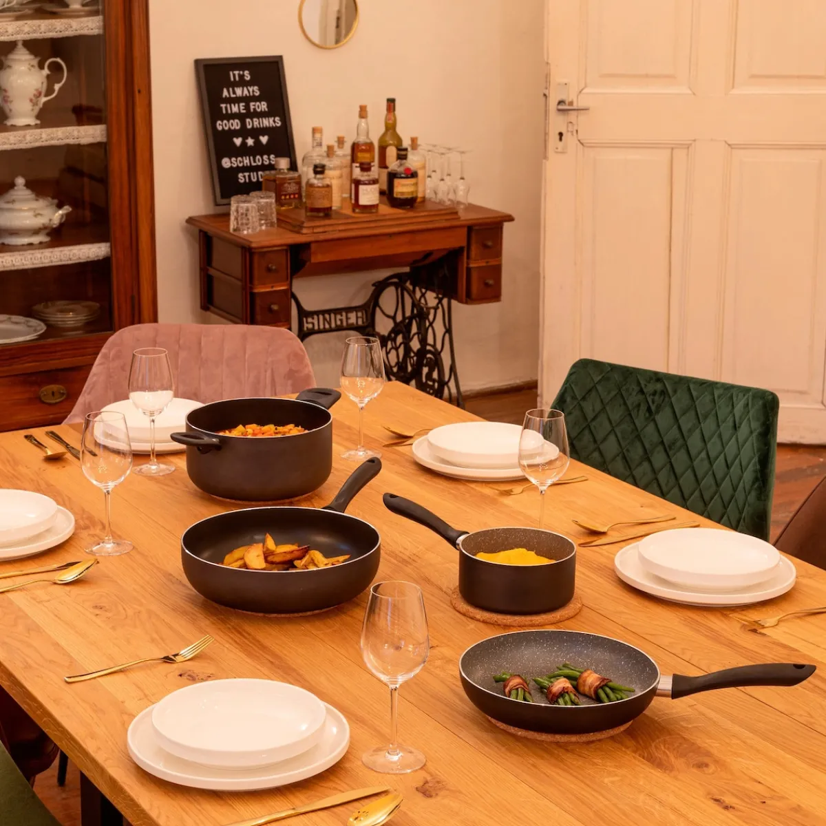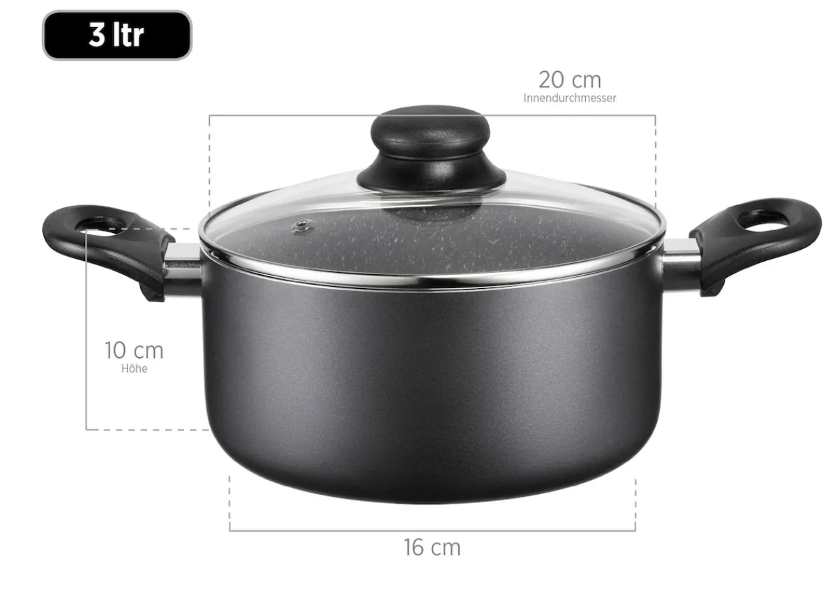 Dieses in jeder Hinsicht praktische Kochgeschirr-Set der österreichischen Traditionsmarke MÄSER punktet mit einer hochwertigen Antihaft-Beschichtung für fettarmes Kochen, einer angenehm leichten Bauweise sowie einem schnell aufheizenden, induktionsgeeigneten Bodenaufbau. Durchdachte Details wie die Aufhängelöcher in den Stielgriffen, die hitzeabweisenden Kunststoffgriffe auch an den Glasdeckeln oder die in die Deckel integrierten Dampfaustrittsöffnungen machen das tägliche Kochen mit dieser Kollektion zum Vergnügen. Der Topfdeckel mit 24 cm Durchmesser kann gleichermaßen für die Bratpfanne genutzt werden. Für eine lange Lebensdauer Ihres Kochsets empfehlen wir die händische Reinigung mit weichen Materialien sowie das Hantieren mit nicht-metallischen Küchenhelfern (z.B. aus Kunststoff oder Holz).