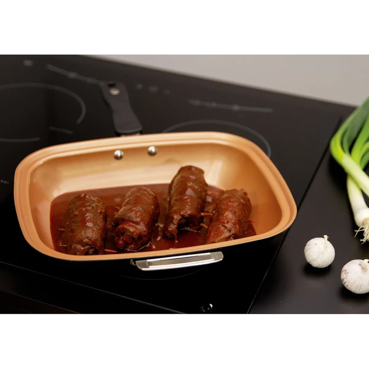 Braten Sie einen Truthahn im hohen Bräter, setzen Sie den flachen Bräter auf und schmoren Sie saftige Rippchen. Oder wie wär’s mit heißluftfrittierten Pommes – einfach Copper Crisper in den Backofen und los geht’s!