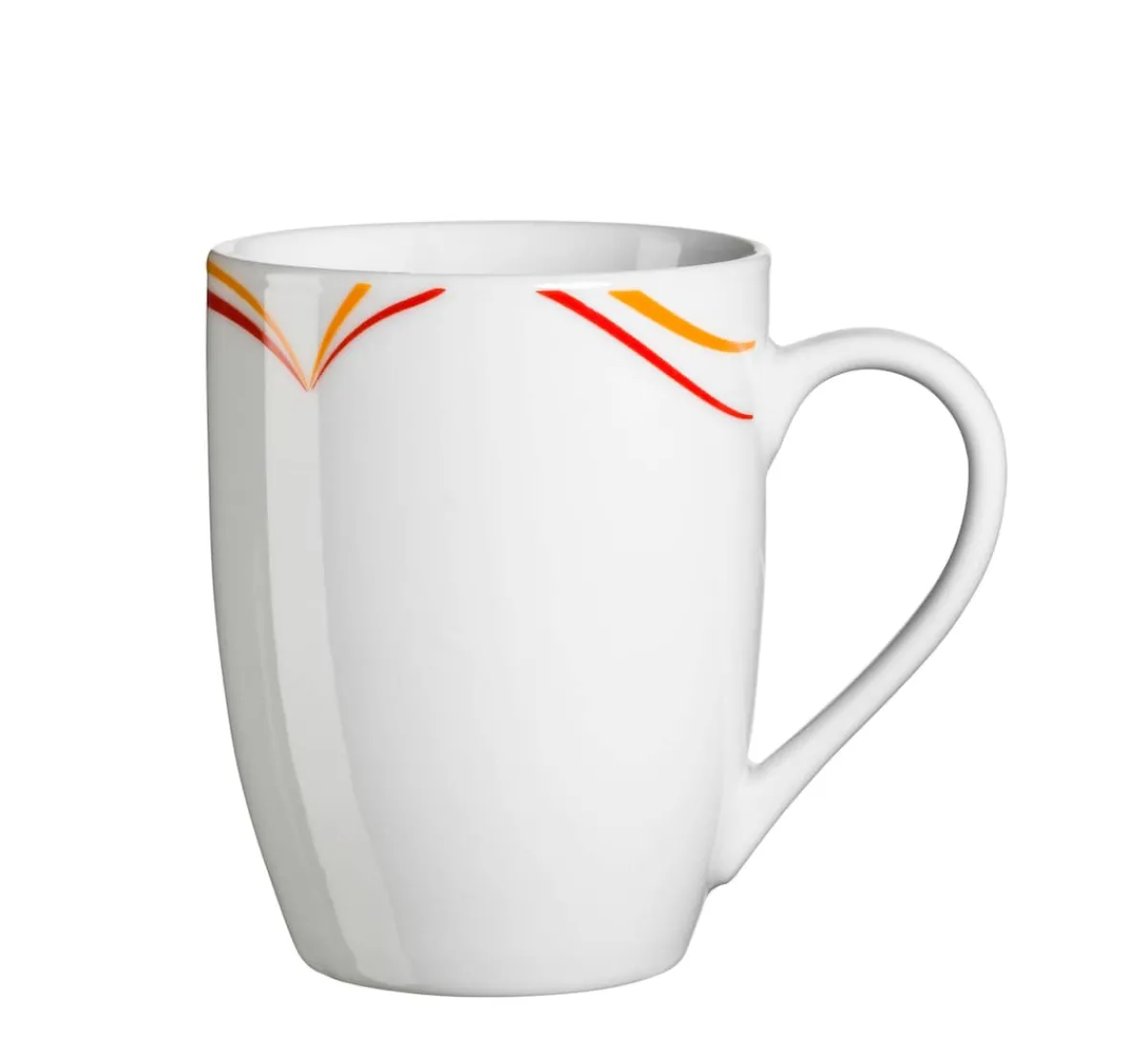 6 x Kaffeebecher bauchig à 29 cl, in der Farbe Weiß, mit Dekor in verschiedenen Orangetönen
