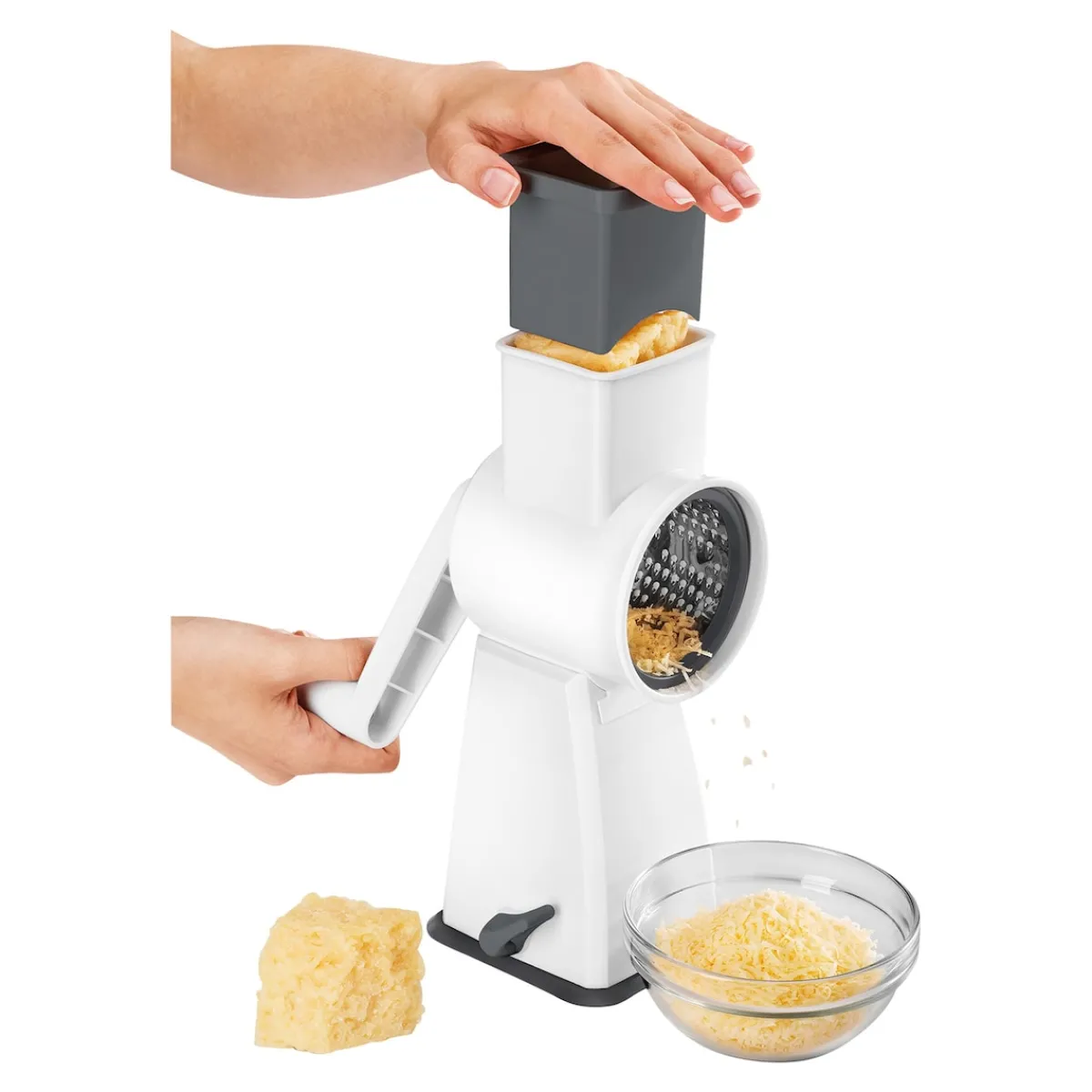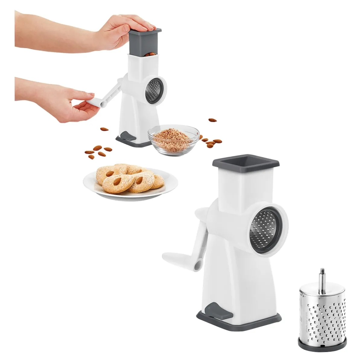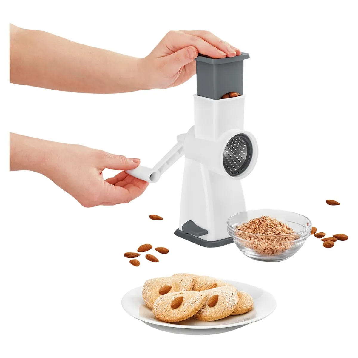 Für Mandeln, Nüsse, Schokolade oder Käse geeignet. Mit Saughebel zur Befestigung am Tisch oder auf der Arbeitsplatte. Mit Inox-Einsatz und Sicherheitsschieber, bzw. Fingerschutz.