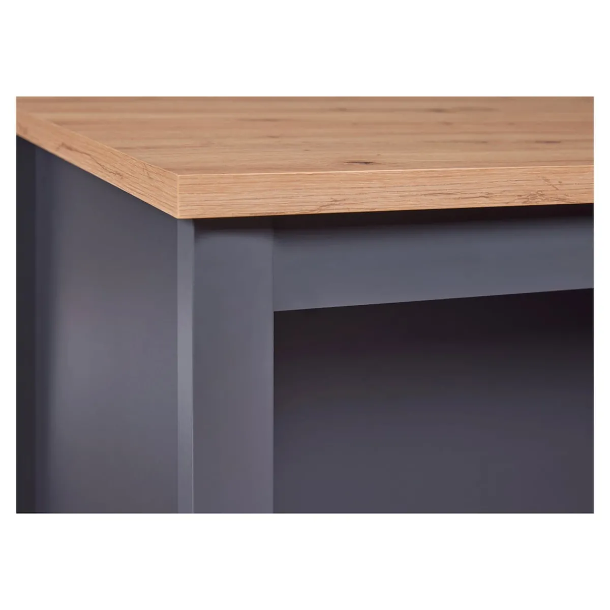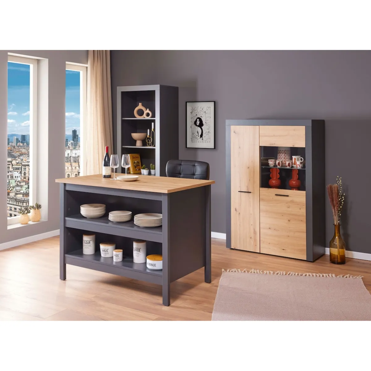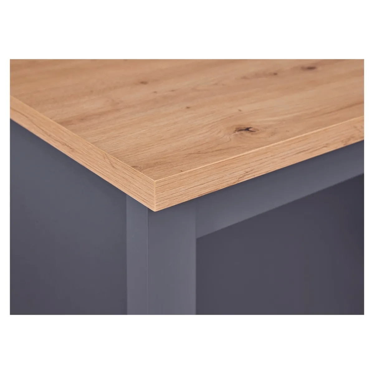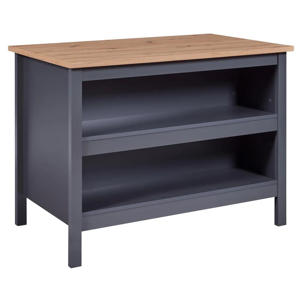 Starten Sie stilvoll in den Tag: Diese vielseitige Kücheninsel in Eichenoptik bietet Ihnen nicht nur eine zusätzliche Arbeitsfläche, sondern auch einen gemütlichen Ort, um Ihre Mahlzeiten zu genießen. Ihr Geschirr und Ihre Küchenutensilien bewahren Sie griffbereit in den 2 großzügigen Regalen auf. Die andere Seite sorgt dank Aussparung für genügend Beinfreiheit beim Sitzen.