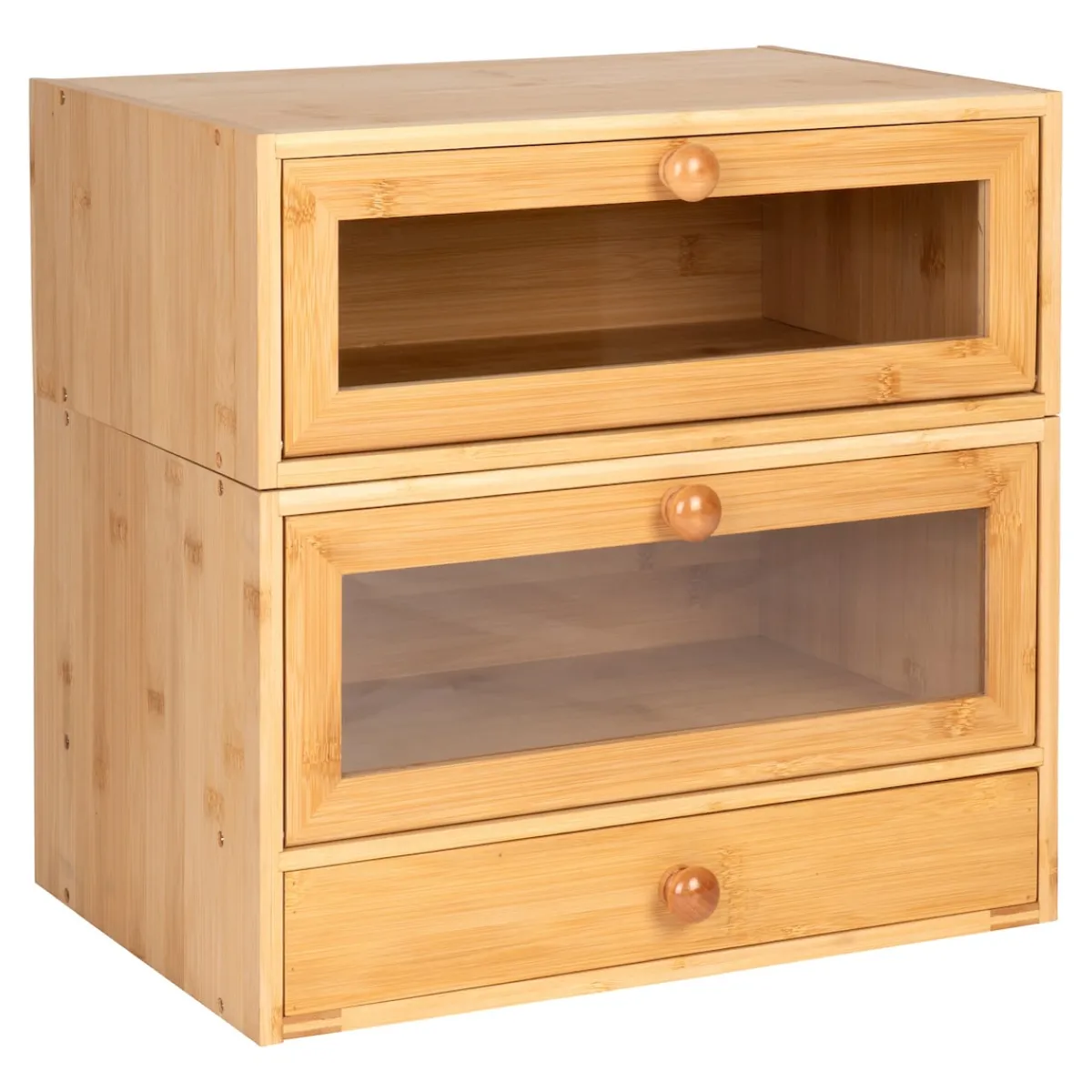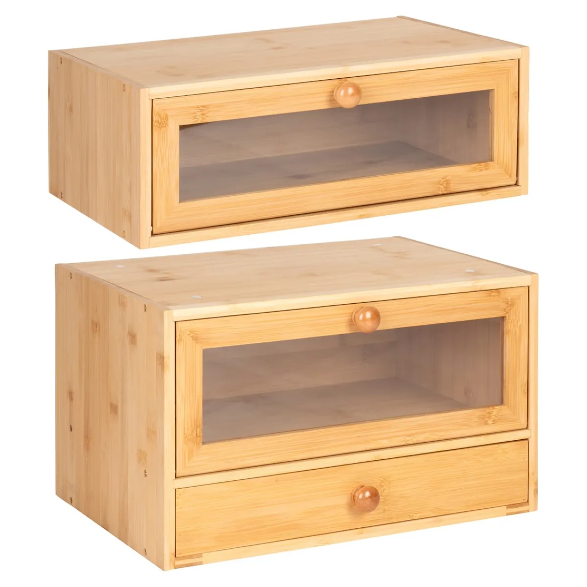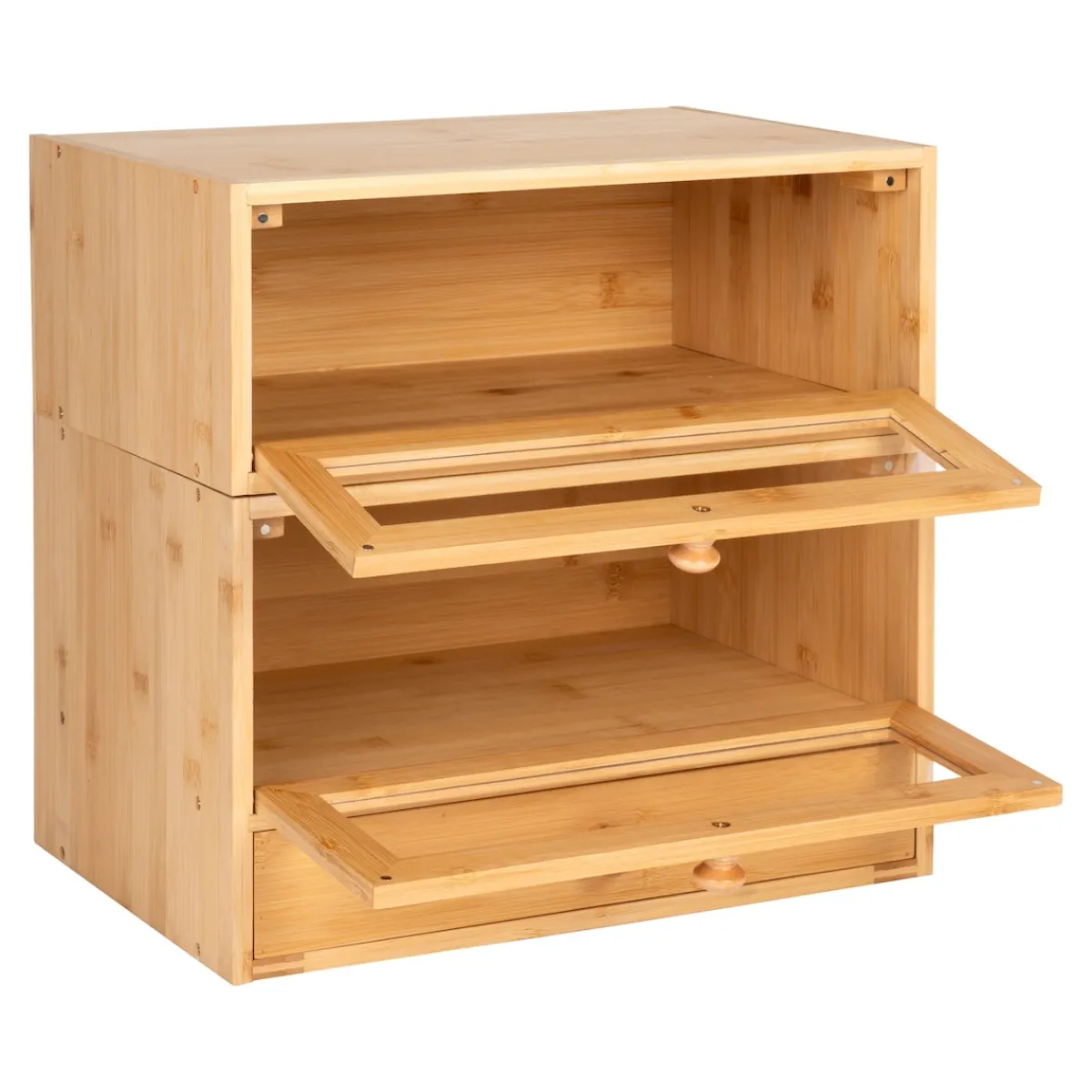Dieses charmante Duo, bestehend aus 2 Fächern mit transparenten Klappen und einer Schublade mit praktischen Einsätzen, macht ungenutzte Flächen zum Aufbewahrungswunder. Ob Gebäck, das frisch bleibt, oder Besteck, das stets griffbereit ist – alles hat seinen Platz. Die Module lassen sich flexibel einzeln nutzen oder platzsparend übereinander stapeln.