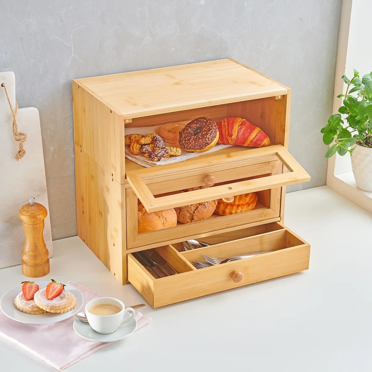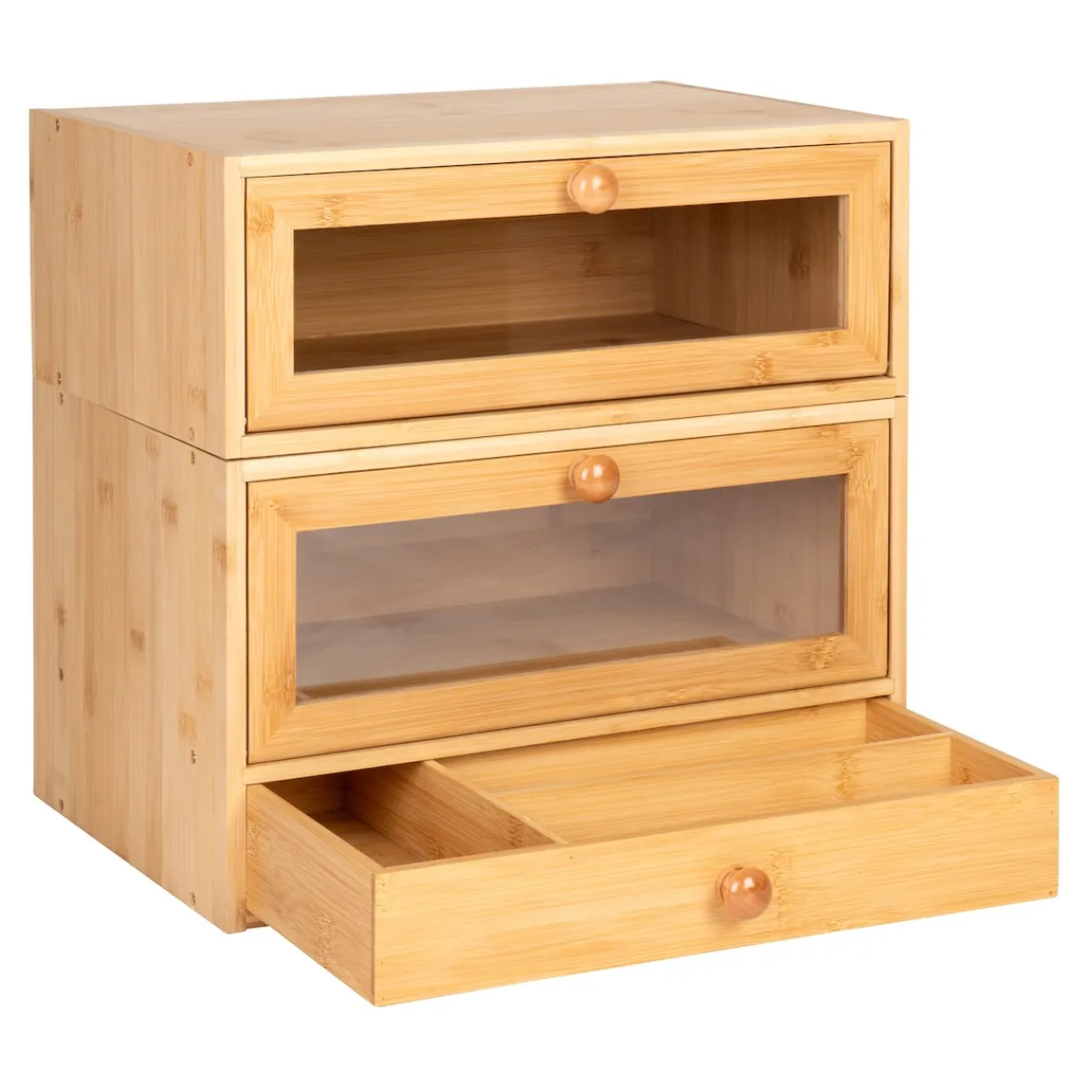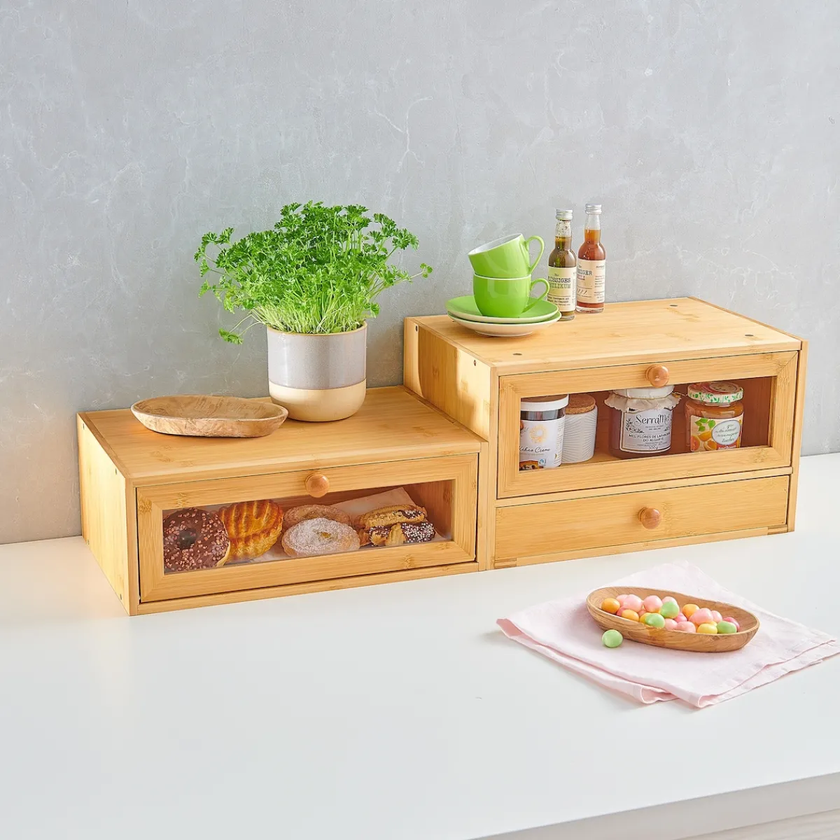 Dieses charmante Duo, bestehend aus 2 Fächern mit transparenten Klappen und einer Schublade mit praktischen Einsätzen, macht ungenutzte Flächen zum Aufbewahrungswunder. Ob Gebäck, das frisch bleibt, oder Besteck, das stets griffbereit ist – alles hat seinen Platz. Die Module lassen sich flexibel einzeln nutzen oder platzsparend übereinander stapeln.