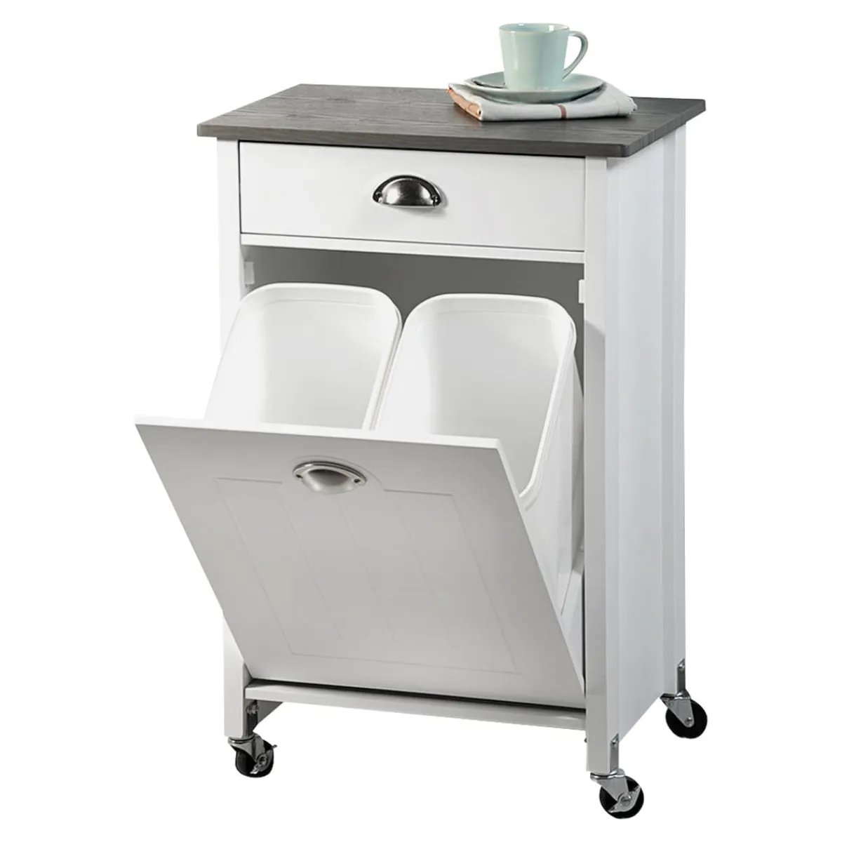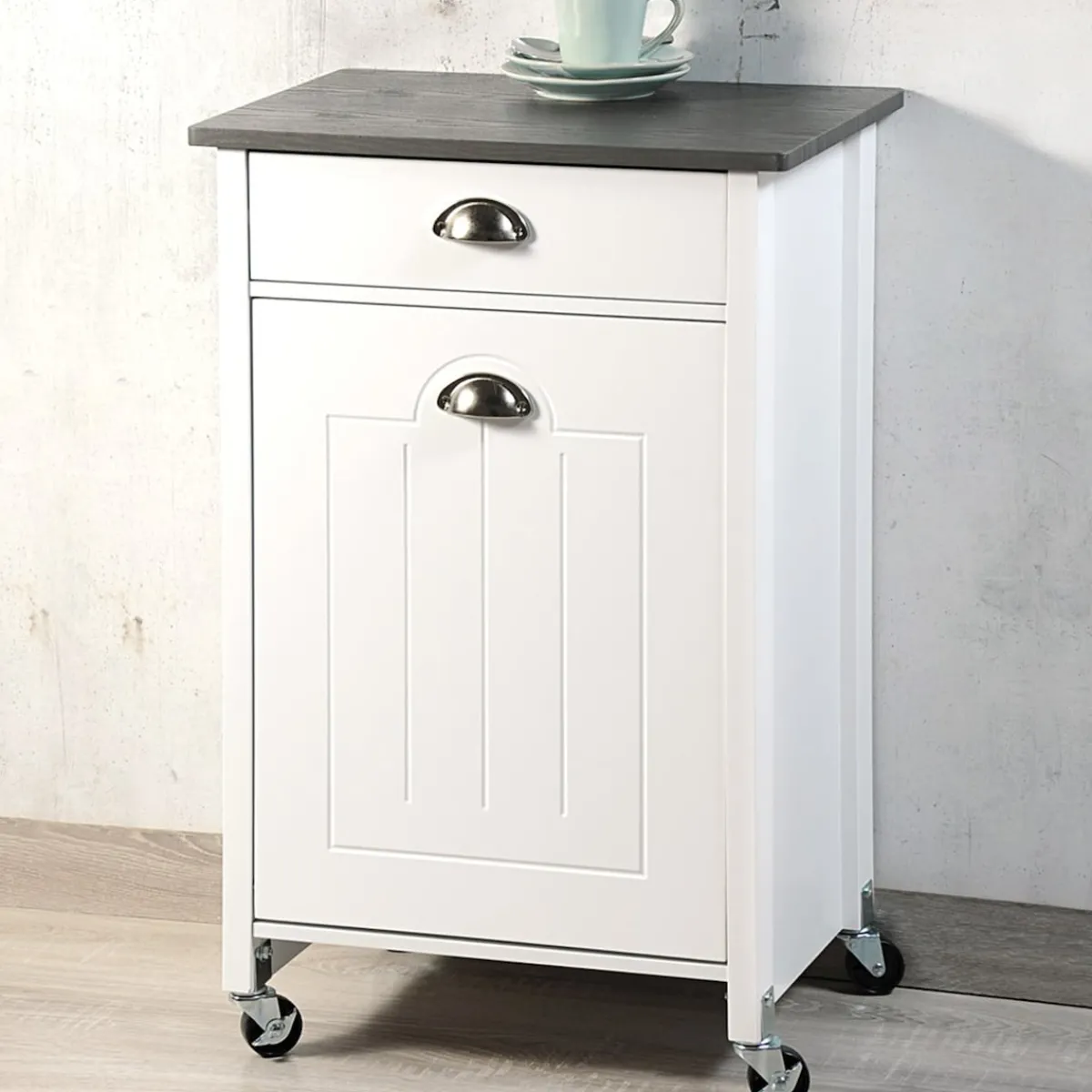 Der KESPER® Küchenwagen aus 100% FSC®-zertifizierter Faserplatte vereint praktische Features wie ein integriertes Mülltrennsystem, mehr Ablage- und Arbeitsfläche und eine praktische Schublade, mit der Sie Ihr Ordnungssystem ergänzen können. Sein schlicht elegantes Auftreten macht Ihn zu einem Must-have für jeden, dem Ordnung in der Küche am Herzen liegt. Der weiße Korpus wird optisch mit einer schicken Arbeitsplatte aus grauer Dekorfolie abgerundet, welche dem Küchenwagen eine moderne und gleichzeitig natürliche Ausstrahlung verleiht. Der klappbare Unterschrank beinhaltet bereits zwei Abfalleimer jeweils mit praktischem Befestigungsring für Ihre Mülltüten. Verschieben Sie Ihn beliebig dorthin, wo er gerade gebraucht wird, denn mit seinen vier vollbeweglichen Lenkrollen und zwei Feststellbremsen steht er Ihnen als praktischer Alltagshelfer, unabhängig vom Einsatzort, immer zur Verfügung!
