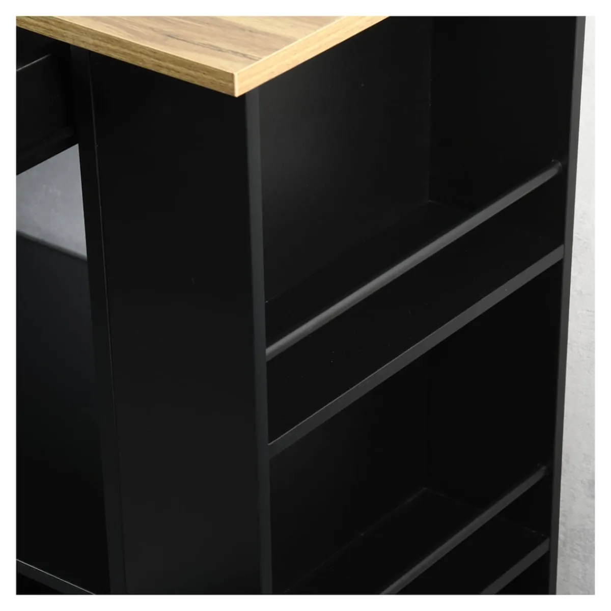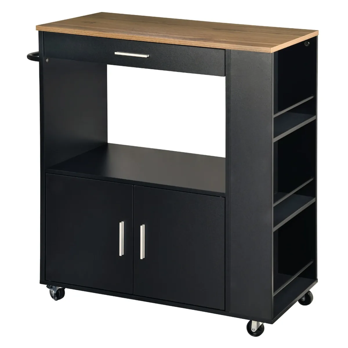 Dank der vier voll beweglichen Lenkrollen bleibt der Wagen flexibel und lässt sich mühelos dort positionieren, wo Sie ihn gerade benötigen. Zwei integrierte Feststellbremsen sorgen dafür, dass er bei Bedarf sicher an Ort und Stelle steht. Das platzsparende Design gewährt Ihnen mehr Bewegungsfreiheit, besonders in kleineren Küchen. Gleichzeitig macht die schlichte, elegante Optik den Küchenwagen zu einem stilvollen Einrichtungselement, das sich harmonisch in jedes Zuhause einfügt. Ob als mobile Arbeitsfläche, Stauraumerweiterung oder praktischer Servierwagen – dieser Küchenhelfer bietet Ihnen jederzeit die Unterstützung, die Sie brauchen.