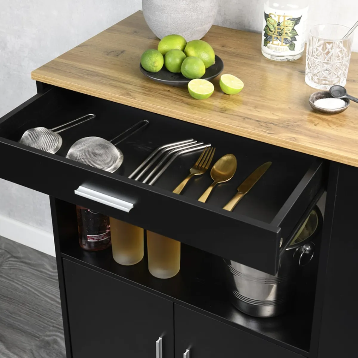 Dieser Küchenwagen überzeugt durch seine durchdachte Aufteilung und hohe Funktionalität – ideal, wenn Sie zusätzlichen Stauraum benötigen und dennoch auf Stil nicht verzichten möchten. Die große Schublade bietet ausreichend Platz für Ihr Besteck oder kleinere Küchenutensilien, während Sie auf der großzügigen Arbeitsplatte bequem Vorbereitungen treffen können. Darunter befinden sich eine offene Ablagefläche für schnellen Zugriff sowie ein weiteres Fach, das sich durch Türen verschließen lässt – perfekt zur Aufbewahrung von Vorräten, Geschirr oder Reinigungsmitteln.