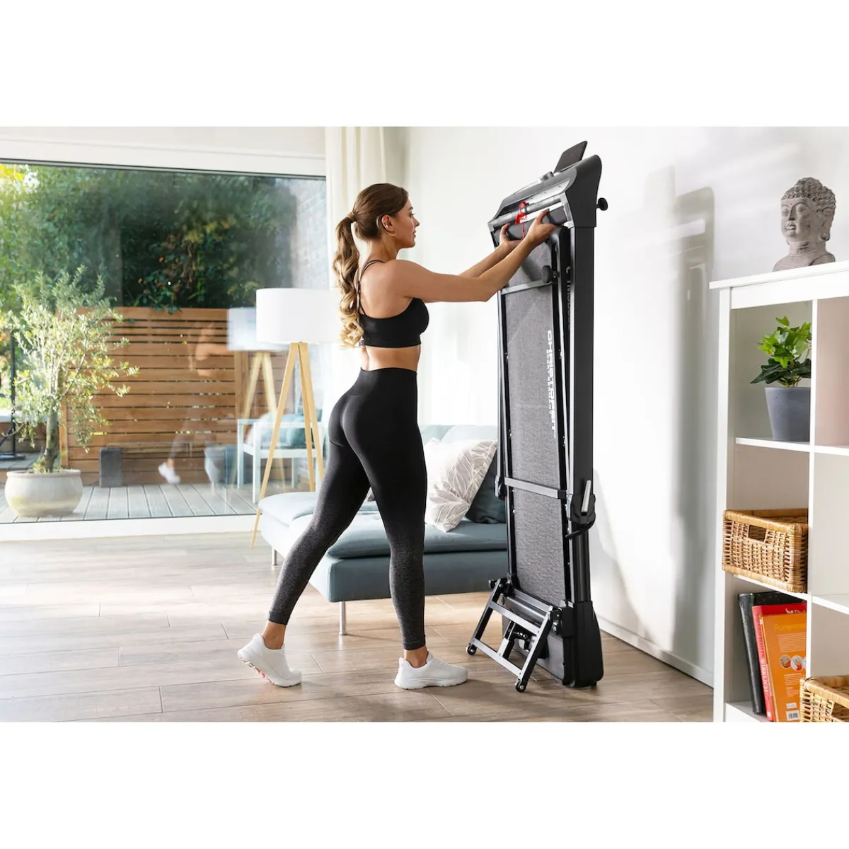 Mit Transportrollen für leichte Standortwechsel und einem einfachen Klappmechanismus zur platzsparenden Aufbewahrung bietet das Laufband TM 3000S eine vollständige Lösung für das Heimtraining.