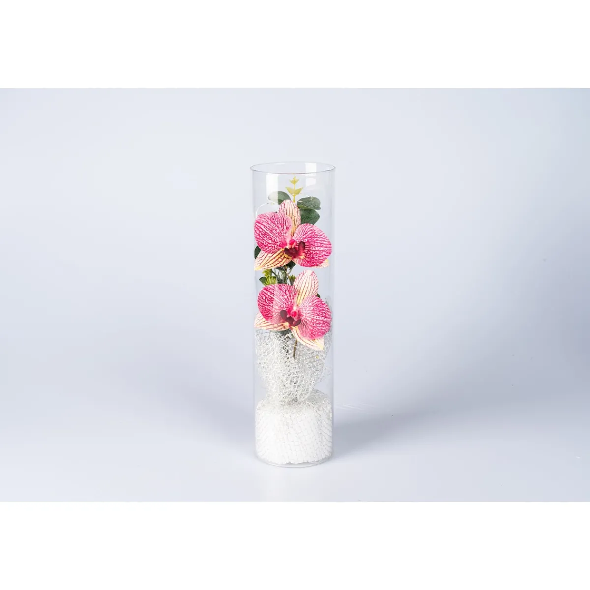 Ein bewundernswertes Arrangement, das die natürliche, unantastbare Schönheit der Orchidee eindrucksvoll in Szene setzt. Selbst im Dunklen sorgen die Blüten, angestrahlt von zarten LED-Lichtern, noch für helle Freude. Tolle Geschenkidee.