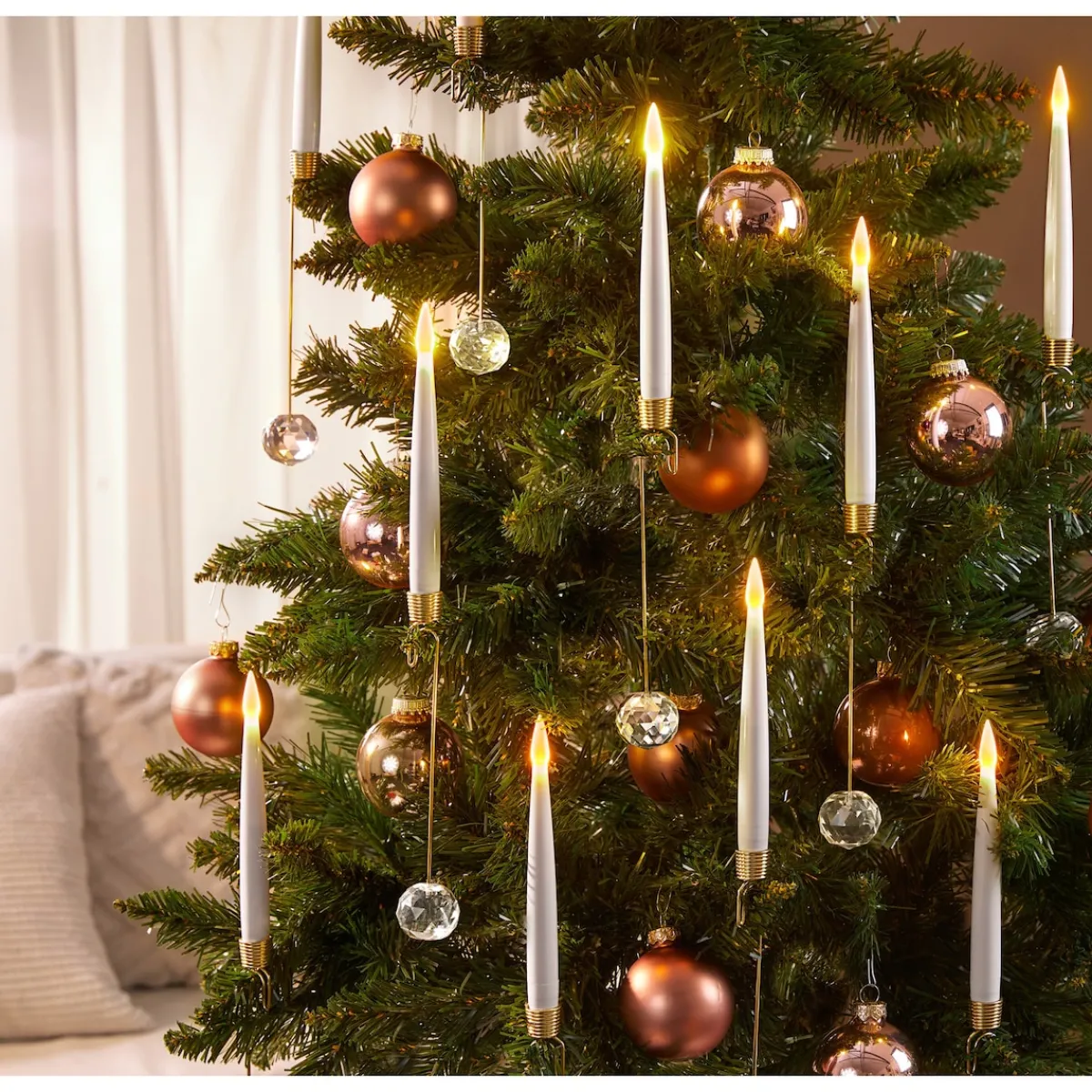 Den perfekt geschmückten Weihnachtsbaum gibt es nicht … oh doch! Dieses Jahr verleihen die edlen LED-Kerzen mit dekorativen Hänge-Elementen einen ganz besonderen Hauch von Magie und Glanz. Jede Kerze erstrahlt in einem sanften, warmweißen LED-Licht, das warme Erinnerungen weckt und für eine bezaubernde Kulisse sorgt, ganz ohne Brandgefahr! In 2 Ausführungen erhältlich: mit schmückenden Kugeln in Diamant-Optik oder goldfarben glänzenden Herzen – auch kombiniert ein wahrer Blickfang.