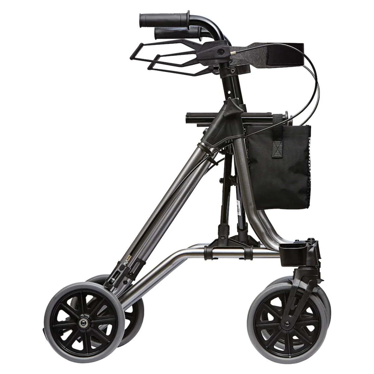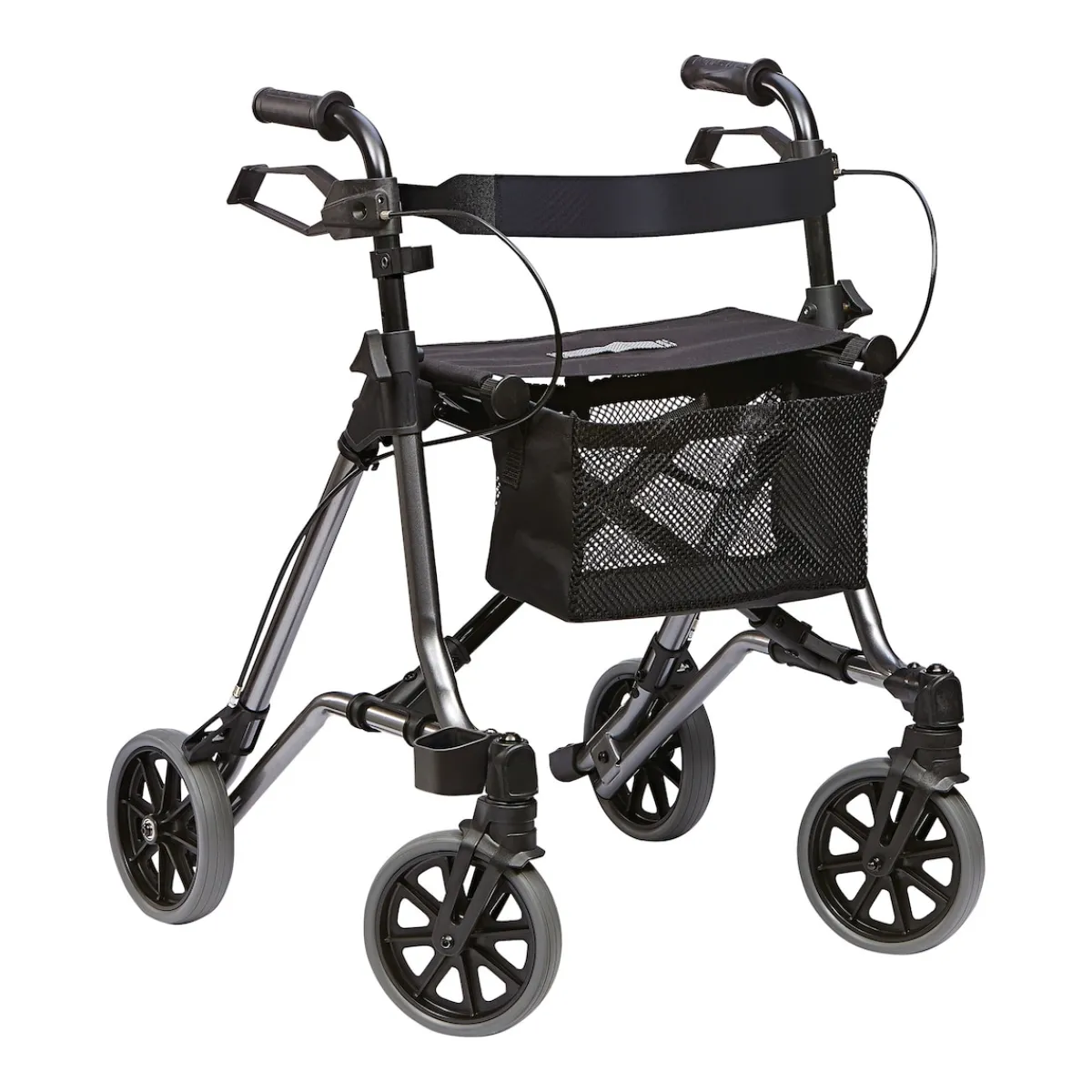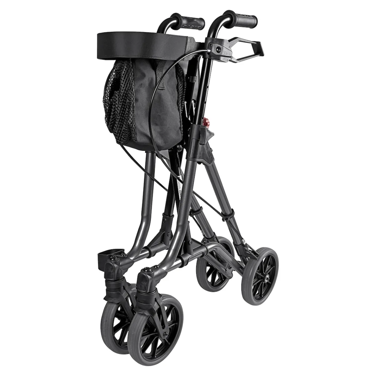 Der Taima M-Eco überzeugt durch seinen robusten Stahlrohrrahmen, der mit einem Rückengurt, einem praktischen Einkaufsnetz und einem Gehstockhalter ausgestattet ist. Selbst im gefalteten Zustand bleibt er stabil stehen, was die Handhabung besonders einfach macht.