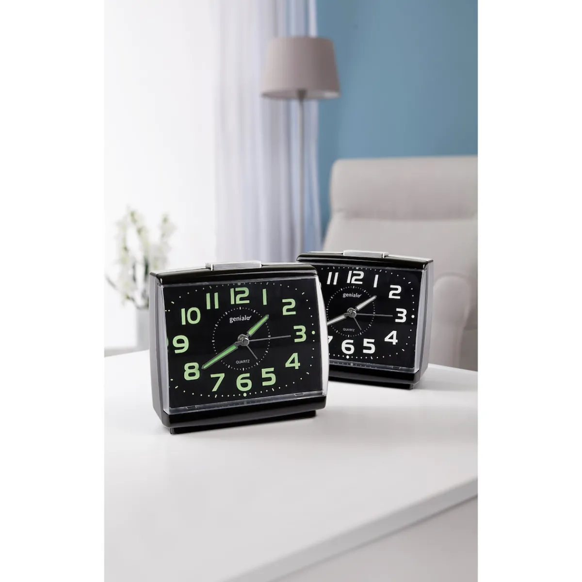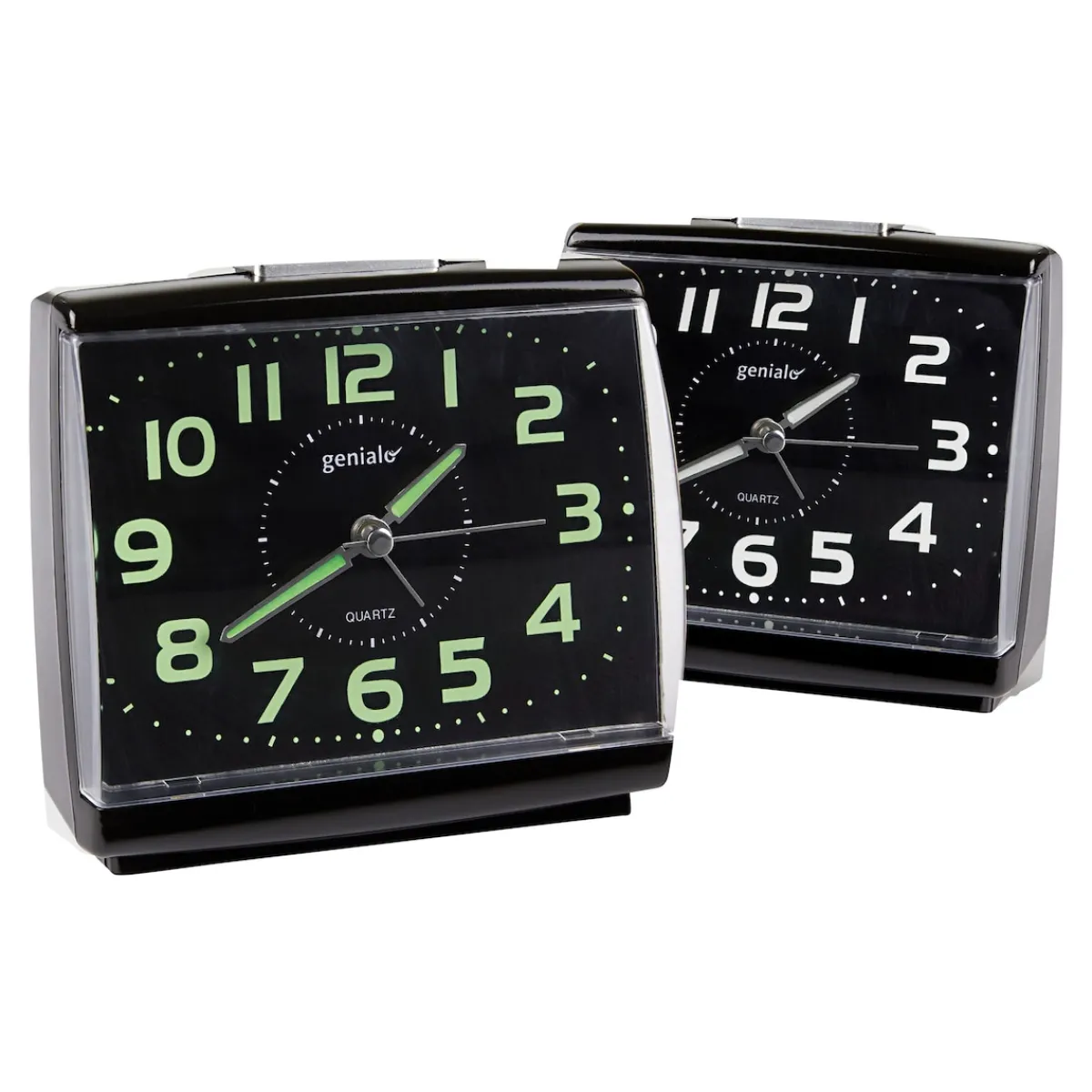 Den Wecker gibt’s im Duo – für Schlaf- und Wohnzimmer. Mit extra großen Ziffern, schleichender Sekunde, Quarzwerk und Alarm.