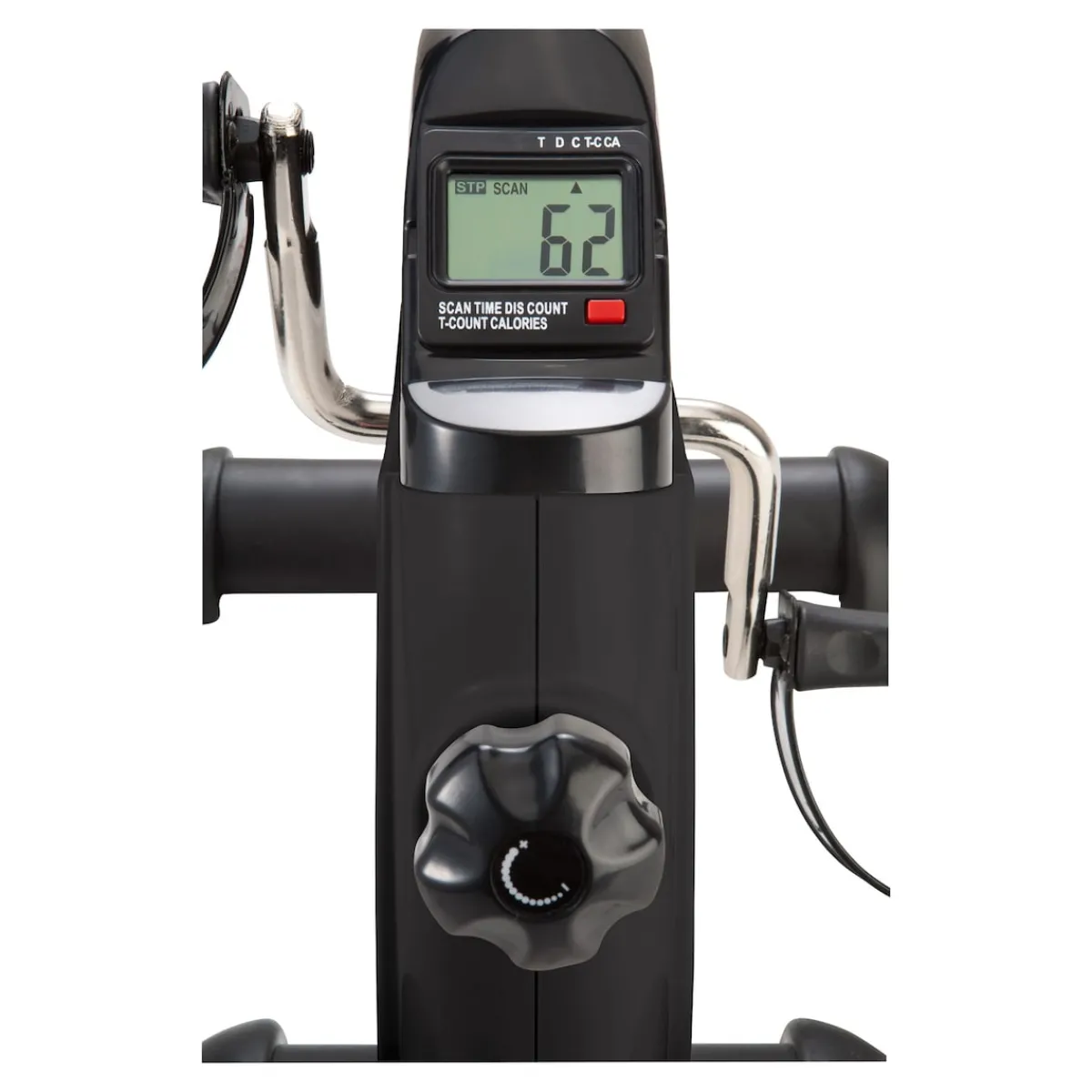 Der Widerstand lässt sich stufenlos einstellen und somit an den individuellen Trainingszustand anpassen. Auf dem LCD-Display können Sie die wichtigsten Trainingsfakten ablesen: Trainingszeit, Entfernung, Umdrehungen und Kalorienverbrauch werden hier angezeigt. Und nach der kleinen Trainingseinheit lässt sich der Mini-Heimtrainer ganz einfach wieder platzsparend im Regal, Schrank oder einer Nische verstauen.