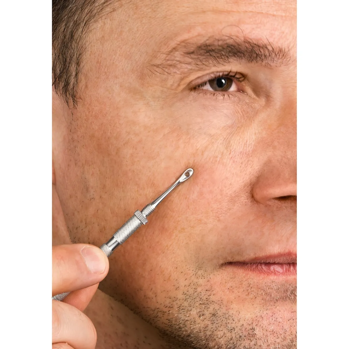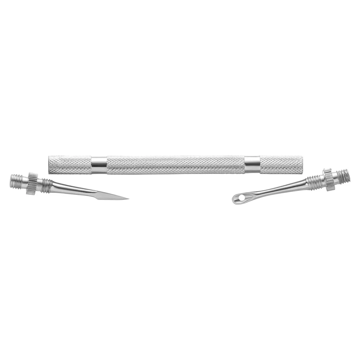 Pickel und Mitesser auf professionelle Art entfernen: mit dem Komedonenquetscher (Mitesserdrücker) und dem sehr spitzen Milienmesser (Grießkornmesser). Beide Endstücke lassen sich ab- und sicher in den Griff schrauben. Rostfreier Chirurgenstahl.